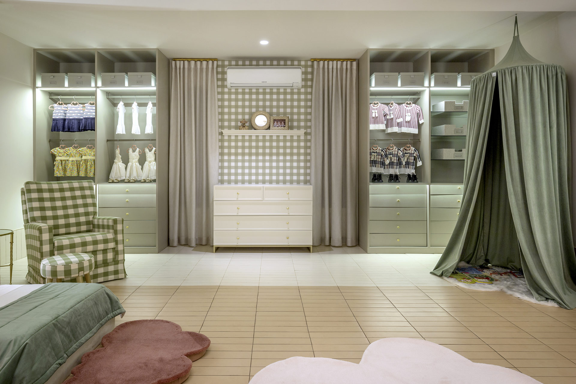 Penteadeira, cozinha e mesa de chá, em formato de miniatura, dão aspecto lúdico ao espaço. Bastante amplo e iluminado, o quarto tem como proposta ser um ambiente de diversão e de interação entre as crianças e a família.