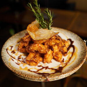 – Crocante de porco preto: pernil de porco preto com flor de rúcula e mousseline de queijo;