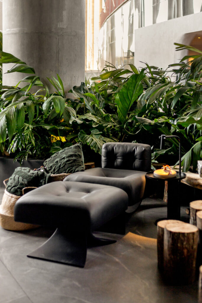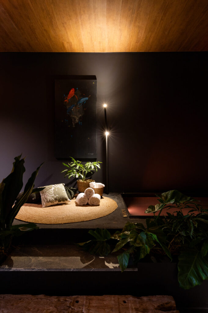 Cores e pigmentações mais sóbrias foram escolhidas para compor o ambiente, em uma proposta bastante diferenciada dos trabalhos até então desenvolvidos pelo escritório de arquitetura. Os tons mais escuros possibilitam uma maior sensação de aconchego e proporcionam dramaticidade ao espaço. O vinílico no teto na cor angelim e o paisagismo, concebido pelos arquitetos Gabriel Domingues de Sousa e Bárbara Oliveira Queiroz, servem de contraste à atmosfera mais melancólica do ambiente.