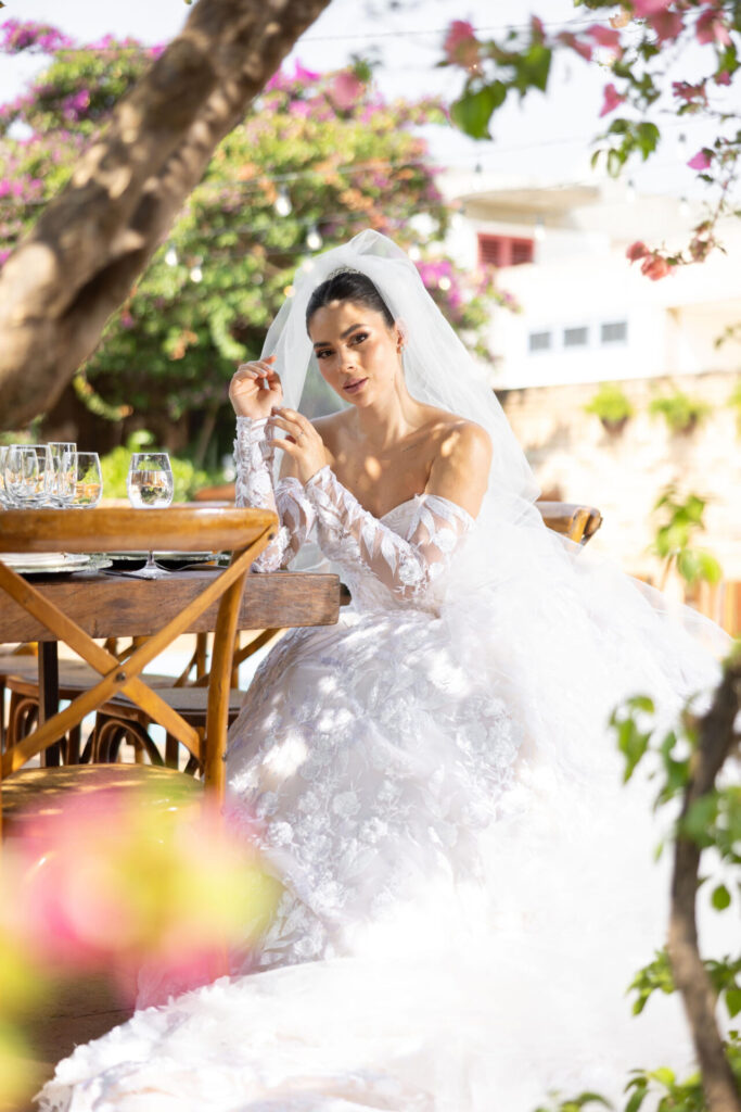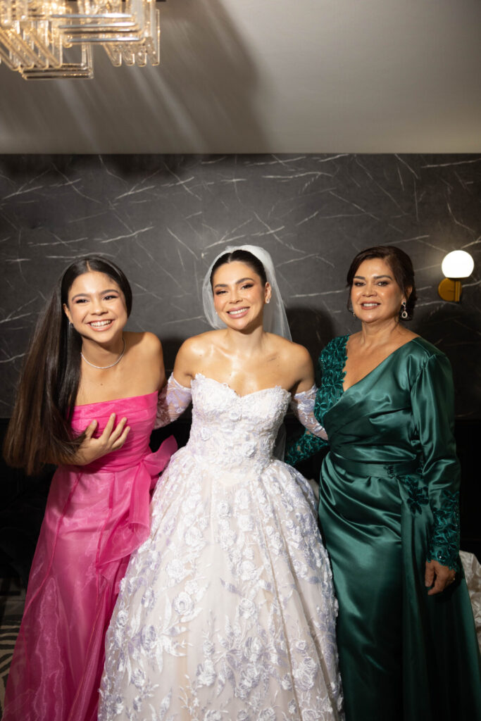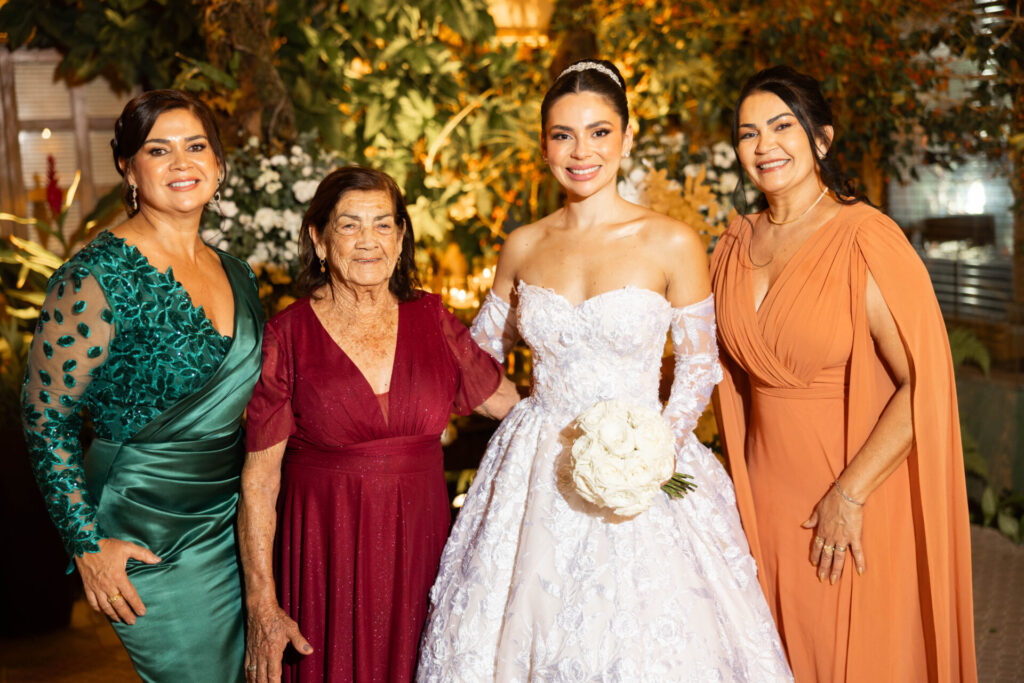 A noiva, em uma aparição digna de conto de fadas, desfilou com um vestido sob medida da estilista Elizabeth Santos, da grife Santis. A criação, com 26 metros de renda delicadamente adornada com flores 3D, 13 camadas de tecidos esvoaçantes e uma cauda de quatro metros, trouxe um toque de sofisticação e romantismo. Os acessórios exclusivos, assim como o vestido da dama de honra, também foram assinados pela grife, reforçando o glamour do grande dia.