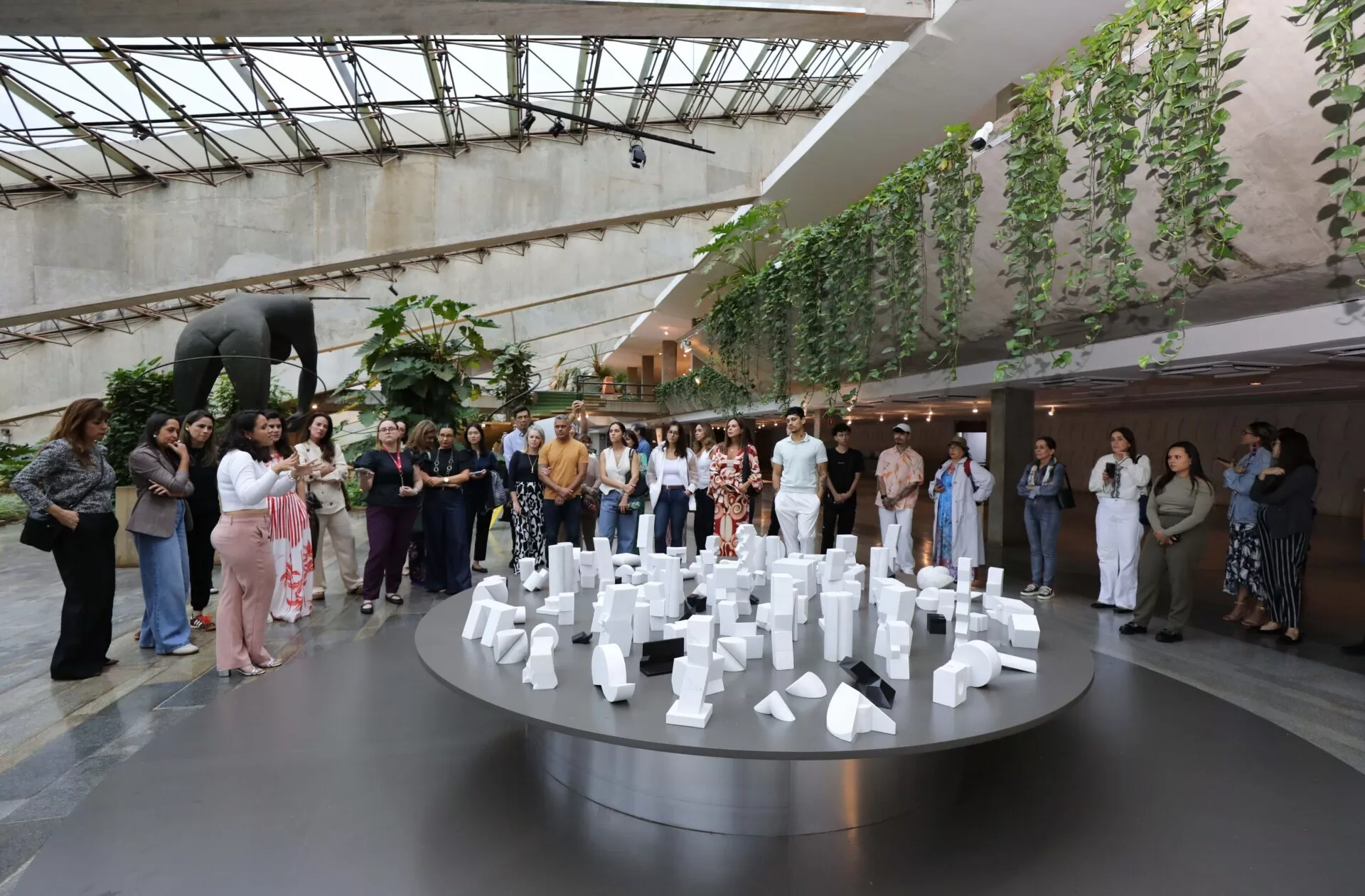 A visita contou com a mediação da art advisor Monica Tachotte, que destacou a relevância da exposição para a capital federal. “A obra de Sérgio Camargo dialoga diretamente com a arquitetura moderna de Brasília”, afirma. Segundo ela, o percurso privilegiou os trabalhos iniciais, marcados por formas mais orgânicas nos anos 1950, e avançou pela produção madura, acompanhando a consolidação de sua linguagem escultórica em materiais como mármore e madeira.