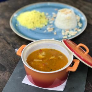 Bobó de camarão, arroz cremoso com castanha do Pará e farofinha de panko.