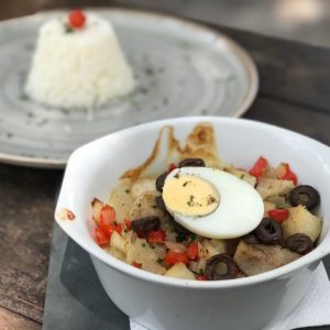 Gratinado do peixe com batatas, cebolas, azeitonas pretas, pimentão vermelho, ovo, coentro e cebolinha. Acompanha arroz branco.