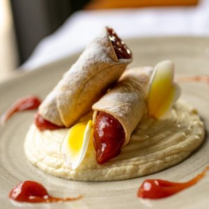 A seção sobremesas conta com seis opções doces. Os destaques ficam por conta do Bolinho quente de milho verde cremoso com doce de leite e sorvete de tapioca (R$ 33); da Cheesecake com compota de caju (R$ 34) e do Cannoli com goiabada com creme de queijo canastra (R$ 32).
