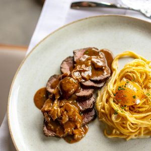 Sua cozinha autoral abraça as culinárias brasileira, italiana e francesa. “Não quis limitar minha técnica e criatividade em uma cozinha só. Quero passear pela gastronomia contemporânea e entregar pratos com personalidade. Sair da minha zona de conforto”, explica. Um bom exemplo é a releitura da Vaca Atolada feita com costela angus em crosta de pistache, aligot de mandioca e crocante de batata doce roxa (R$ 72).