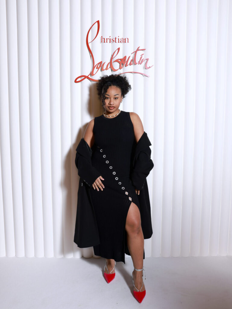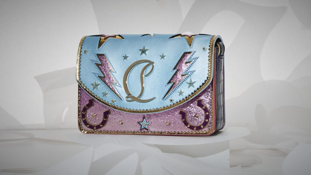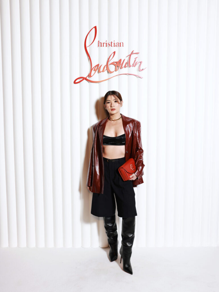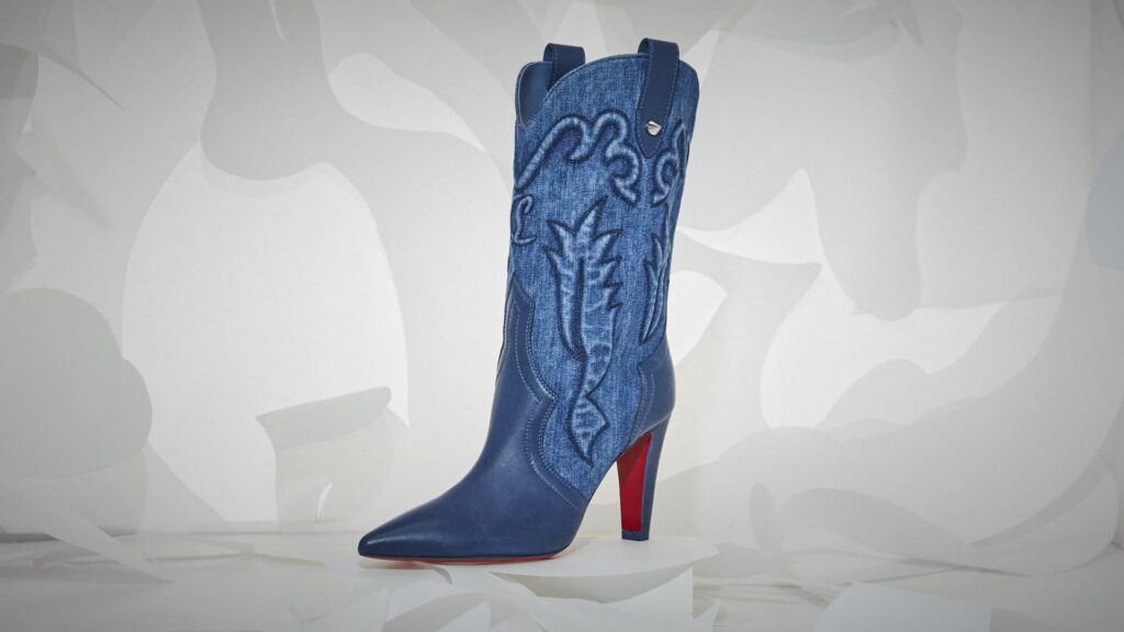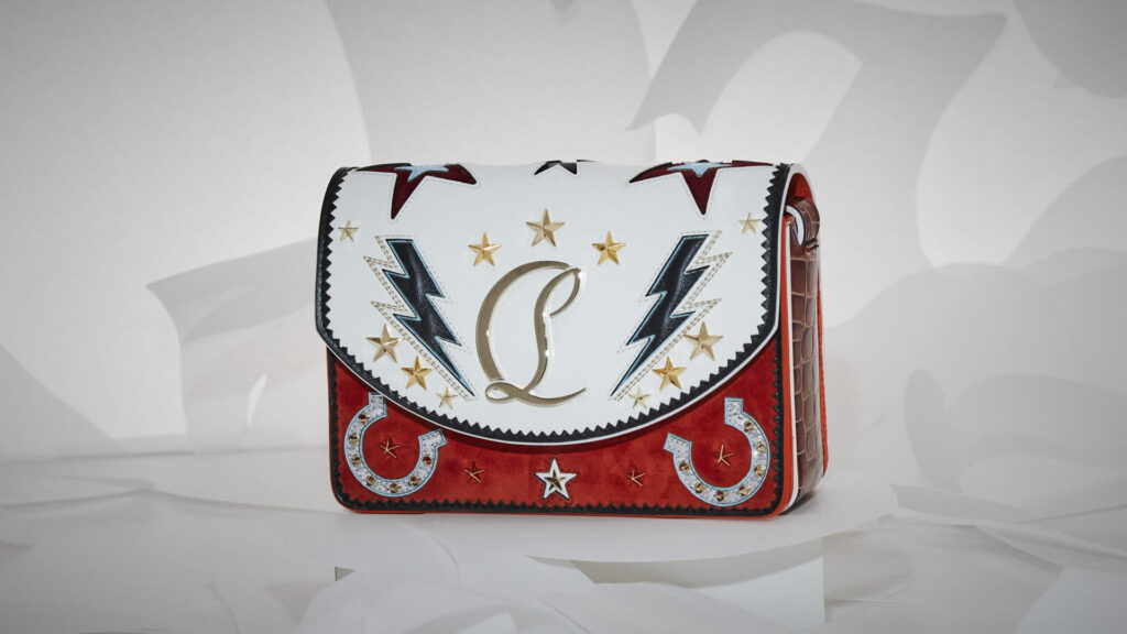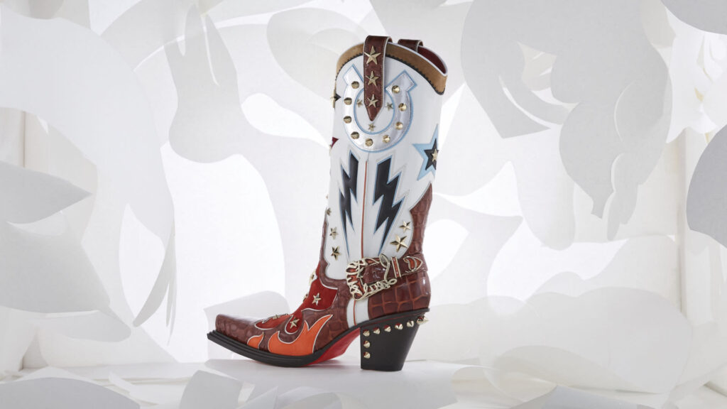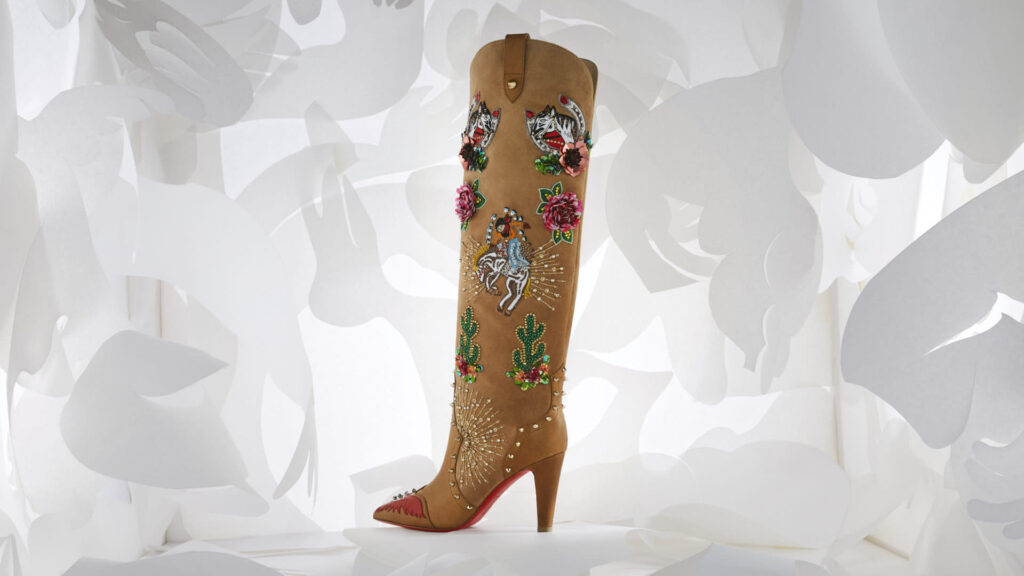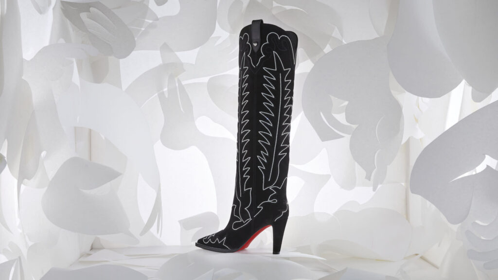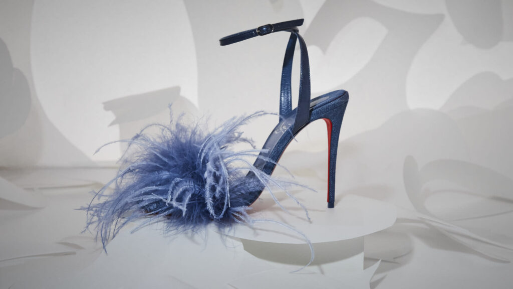 Em meio à celebração, Christian Louboutin revelou sua coleção em um ousado pátio rodeado por colunas. Dentro deste cenário, designs requintados foram exibidos levitando em nichos vermelhos aninhados dentro de uma caixa espelhada cromada, criando um reflexo infinito do espaço.