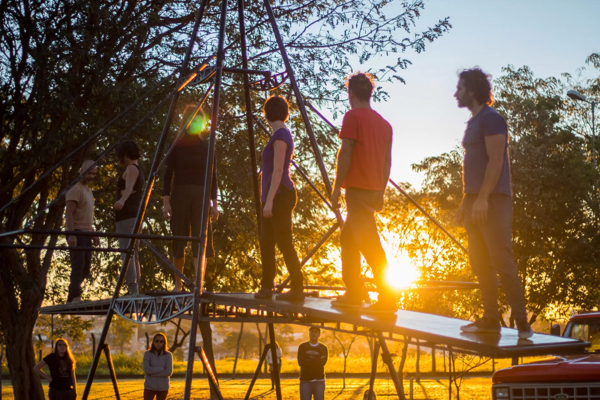 Com elenco formado por sete artistas, a obra busca evidenciar a manualidade do circo e a força da construção como espetáculo em si. Os movimentos cotidianos, como aparafusar e encaixar, transformam-se em cenas de equilíbrio, giros e saltos, levando o público a uma experiência sensorial que dialoga com a ideia de rituais ancestrais e com a história do próprio circo. Ao final, a estrutura é tombada e transformada em escultura, encerrando a apresentação com impacto visual.
