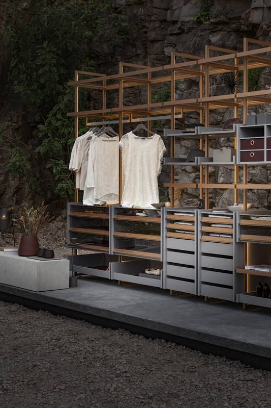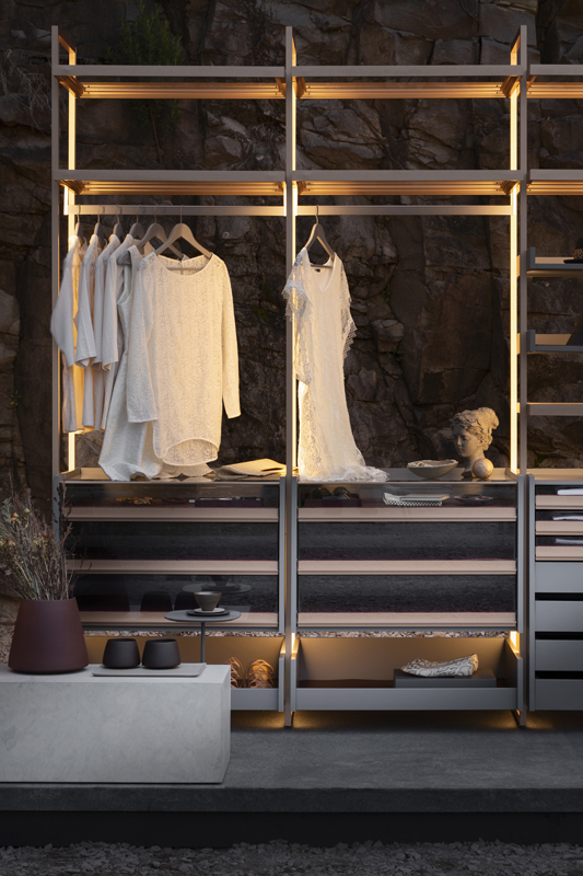 Um closet aberto que equilibra modernidade com conceitos somados à sustentabilidade e à exploração consciente dos recursos naturais. O alumínio é a base do sistema Tilos, um produto infinitamente reciclável, uma escolha responsável. Um conceito que une leveza e flexibilidade compositiva, que dá lugar à beleza e conjuga o brilho do metal, a leveza do vidro e seus reflexos, com o calor da madeira.
