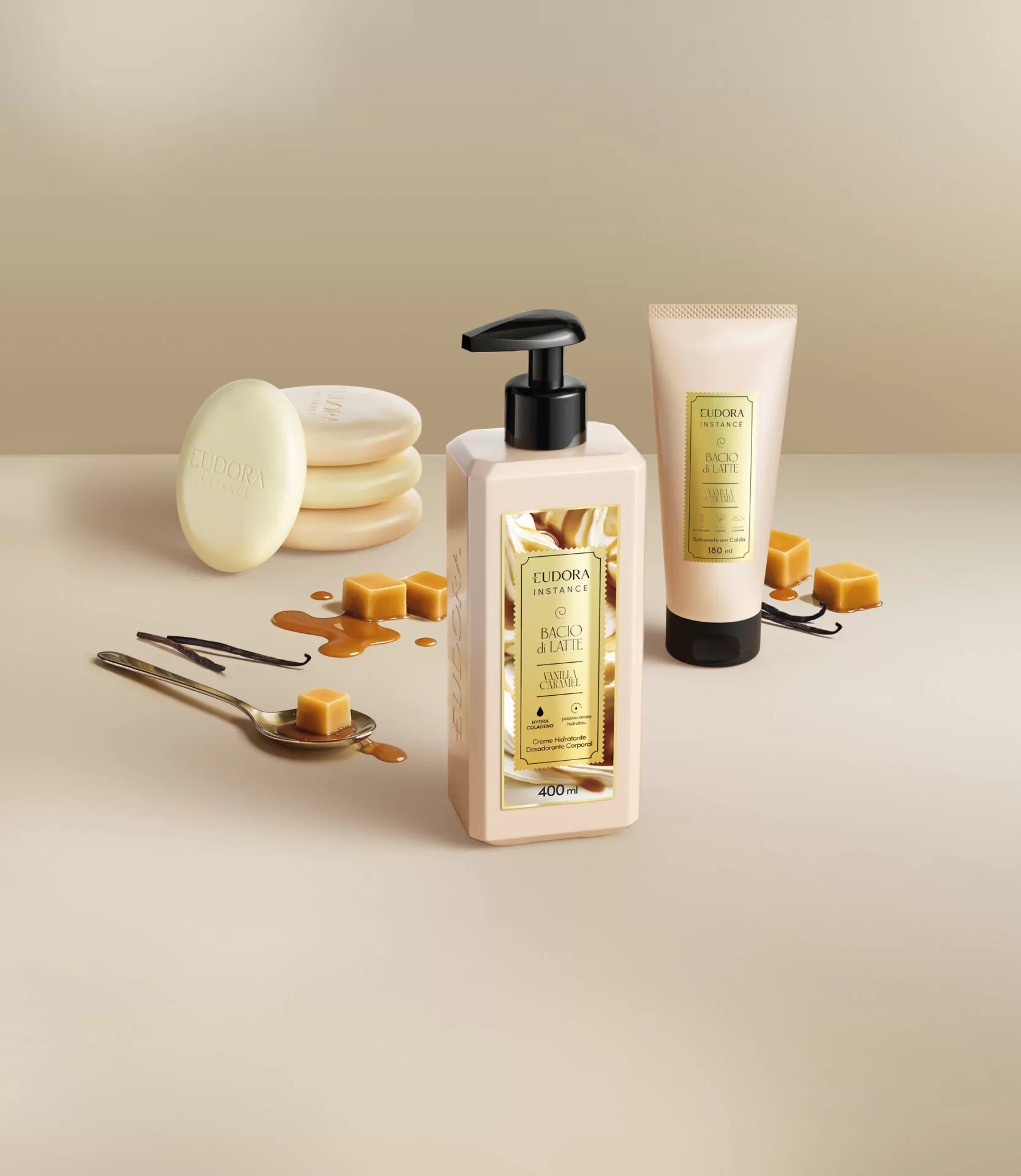 O portfólio traz texturas cremosas e ingredientes inspirados nos gelatos italianos da Bacio di Latte, unindo cuidado com a pele e perfumação. Como símbolo da parceria, foi criado o sabor exclusivo Vanilla Caramel, uma releitura sofisticada da baunilha, além da fragrância Pistacchio — um dos clássicos mais amados da gelateria. Ambas contam com o “Acorde Bacio di Latte”, desenvolvido a partir da casquinha crocante e do sabor original, traduzindo a faceta gourmand em uma experiência única.