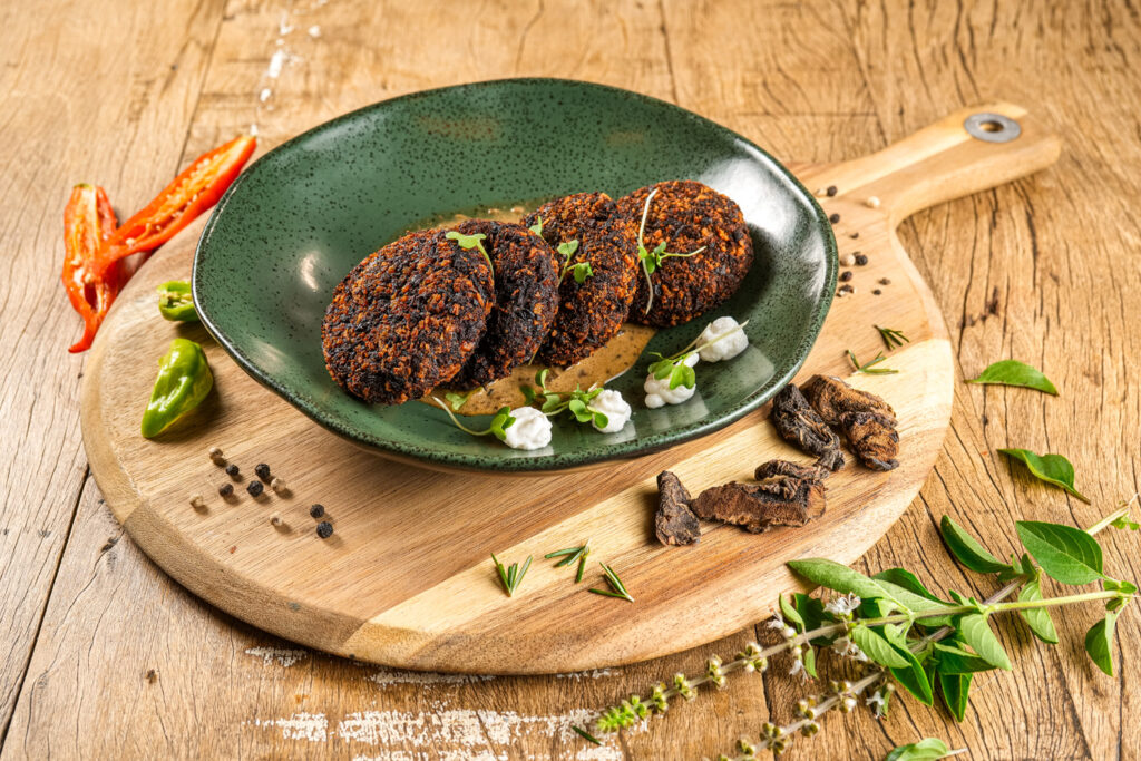 Discos de carne com crosta de funghi sobre molho de cogumelos (R$80).