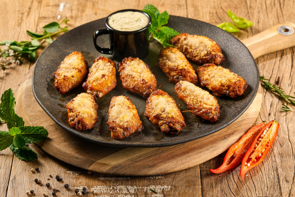 Meio da asa na crosta de parmesão com páprica defumada, cebola em pó, alho em pó, sal e maionese. Acompanha maionese de hortelã (R$69,90).