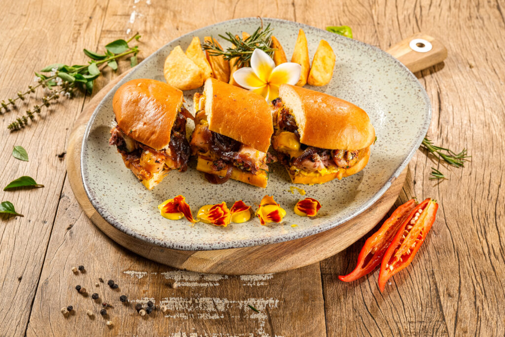 Maré Cheia: sanduíche de polvo no pão brioche de fermentação natural, com polvos salteados em azeite extra virgem, tomates confitados, maionese de ervas e cebola caramelizada. Servido com batatas rústicas (R$ 89).