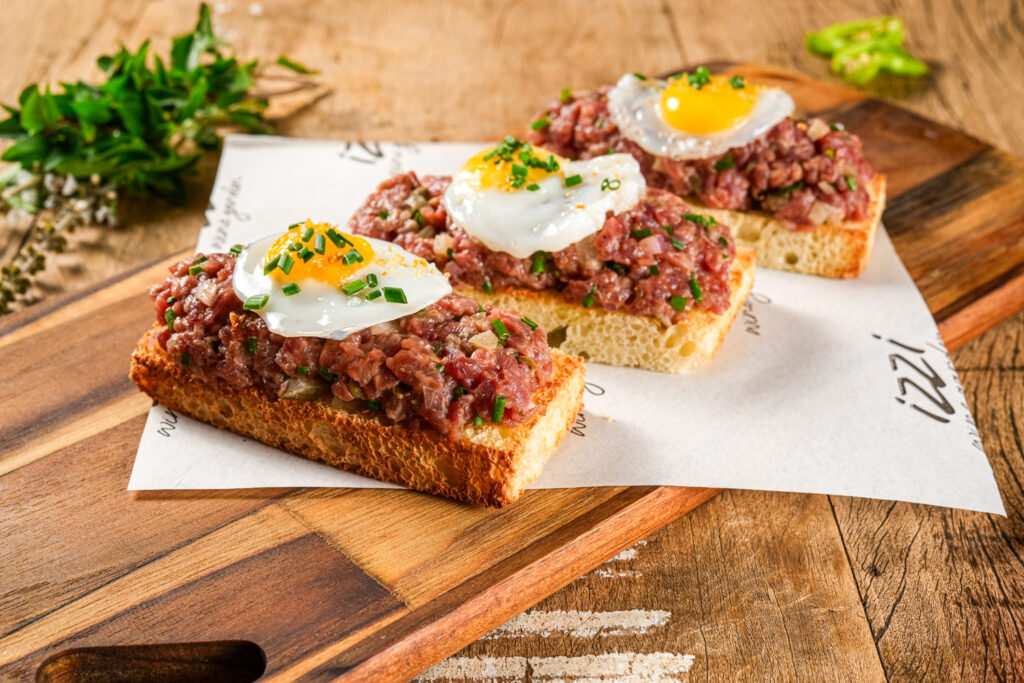 Toast Tartare: toasts do Izzi com steak tartare e ovo de codorna estalado, finalizados com cebolete (R$59).