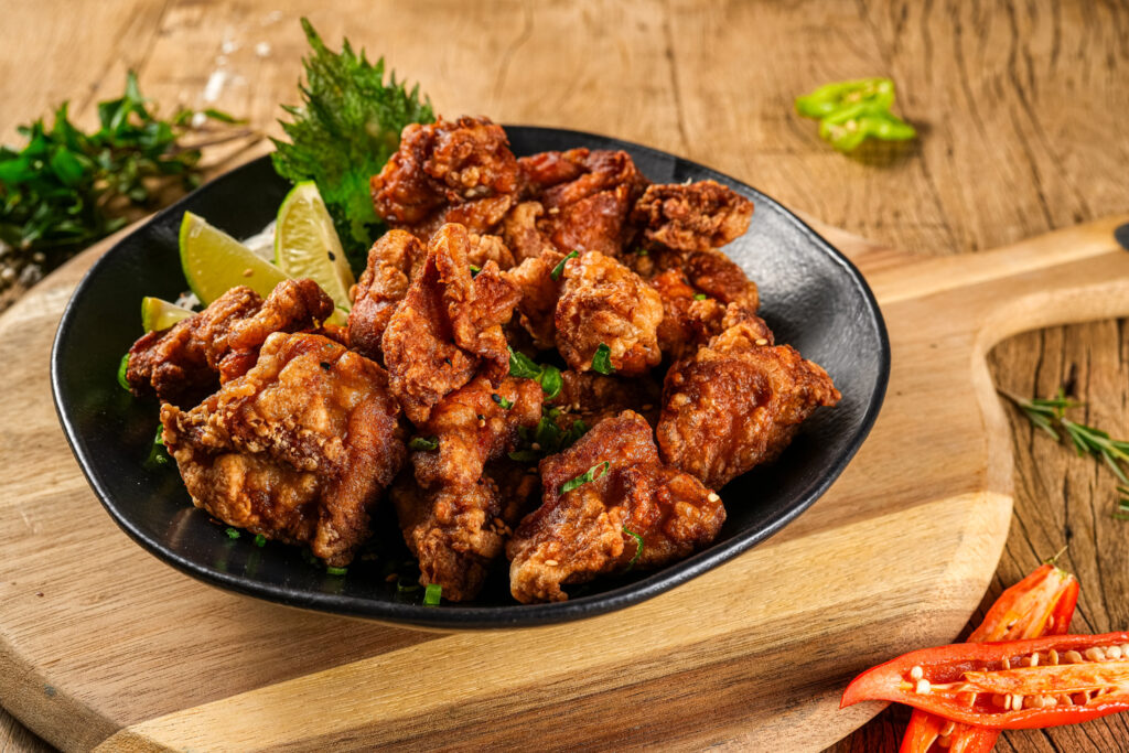 Karaage: frango frito japonês temperado com shoyu, gengibre e sakê, com sabor agridoce e textura macia por dentro e crocante por fora (R$49).