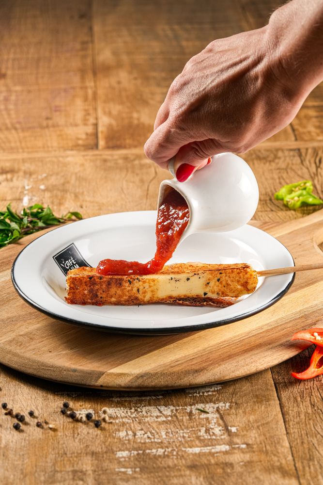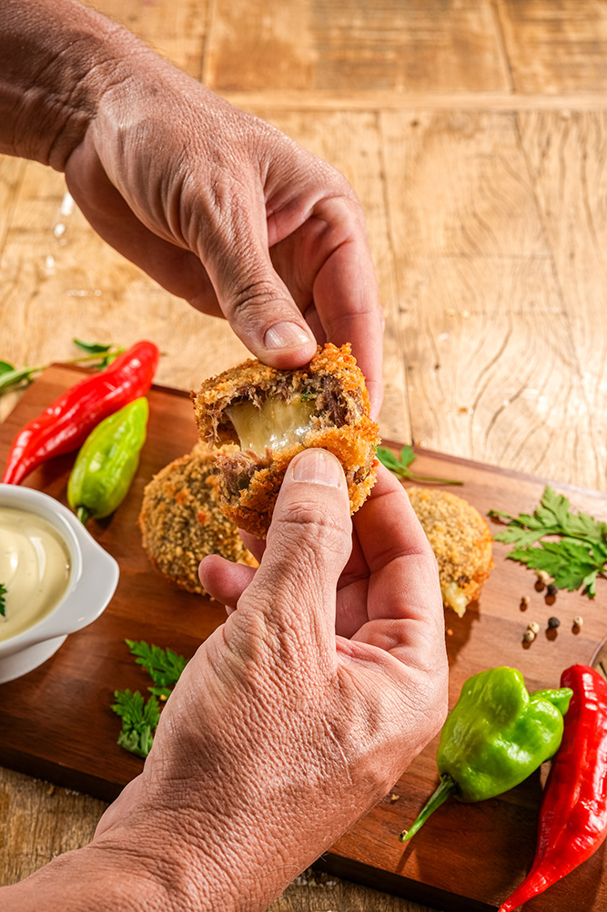 Petisco em forma de disco, com massa de mandioca cremosa, recheado com costela gaúcha desfiada e mussarela. Acompanha maionese verde temperada com salsa e toque de alho (R$28).