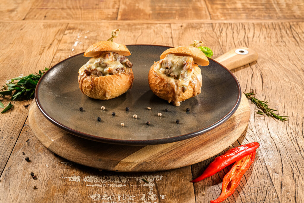 Sanduba de panhoquinha crocante com file mignon, gorgonzola, azeitonas e pimenta verde, gratinado com mussarela