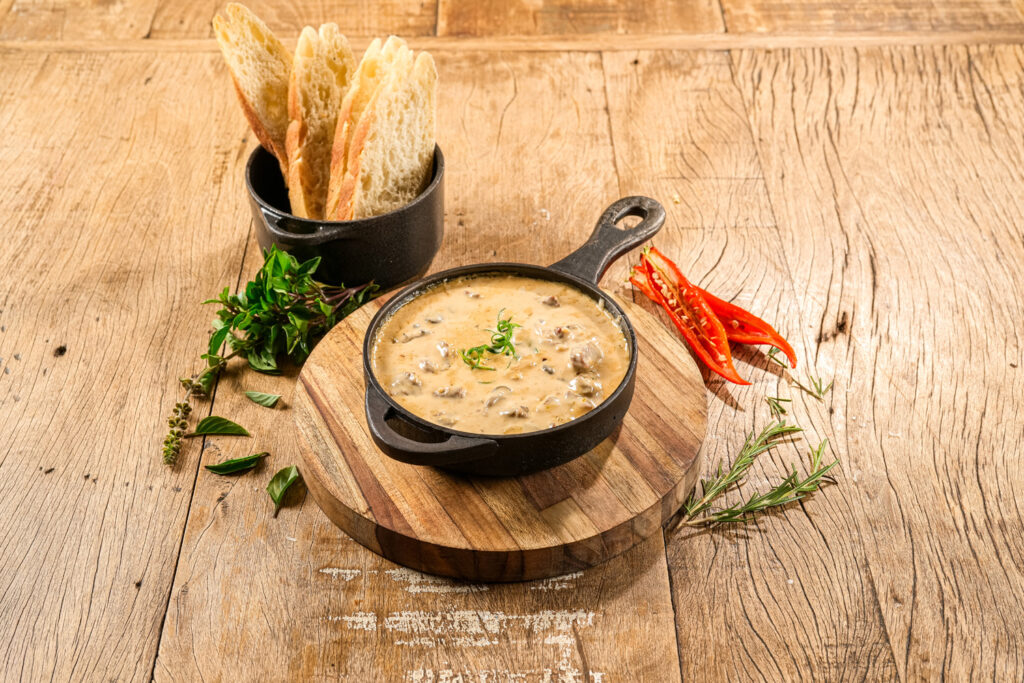 Panelinha de black angus ao molho cremoso de cogumelos e cesta de pães (R$69).