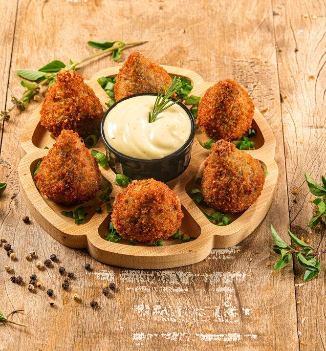 Coxinhas sem massa de costela defumada por 10 horas. Acompanha o exclusivo molho barbecue da casa (R$39).