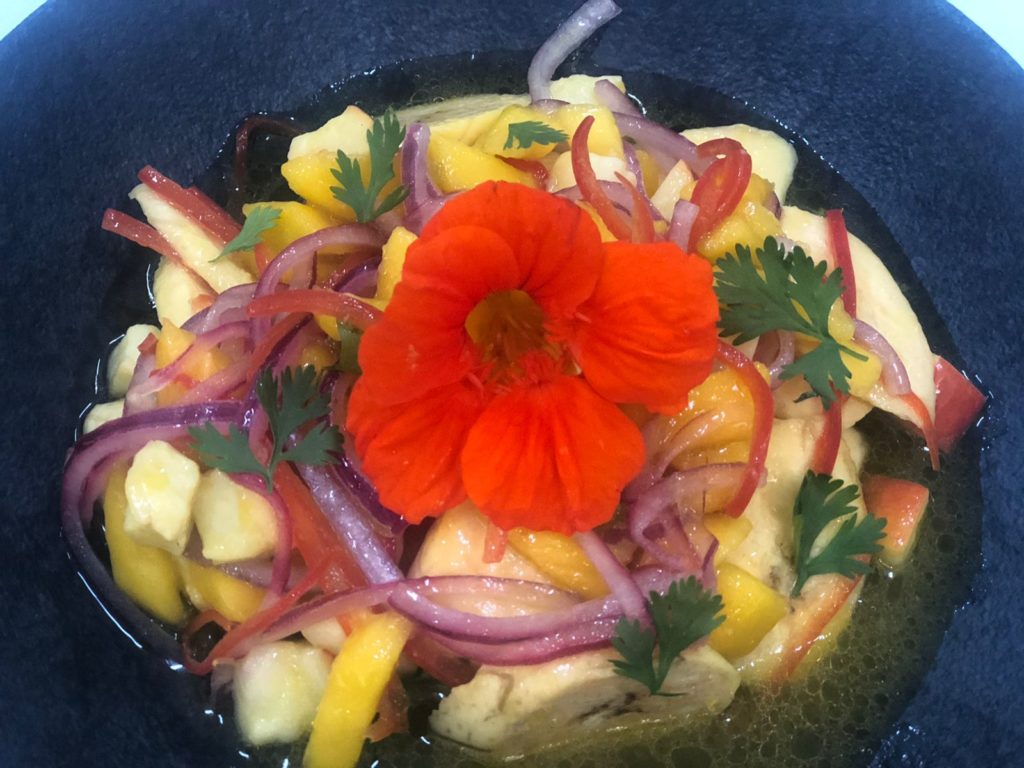 File de Pescada recheado com vatapá, vinagrete de camarão com tomatinho perola e molho de redução caldo peixe com leite coco feito na casa