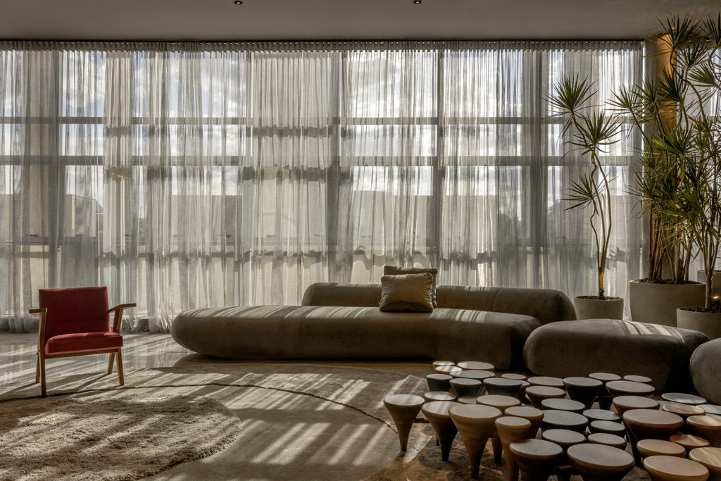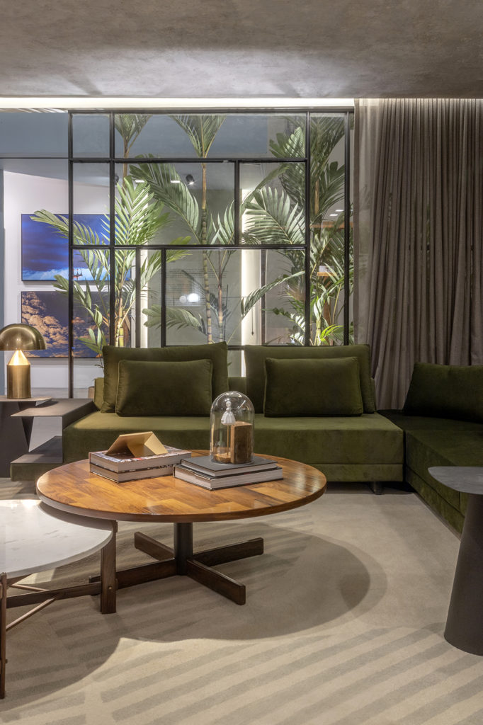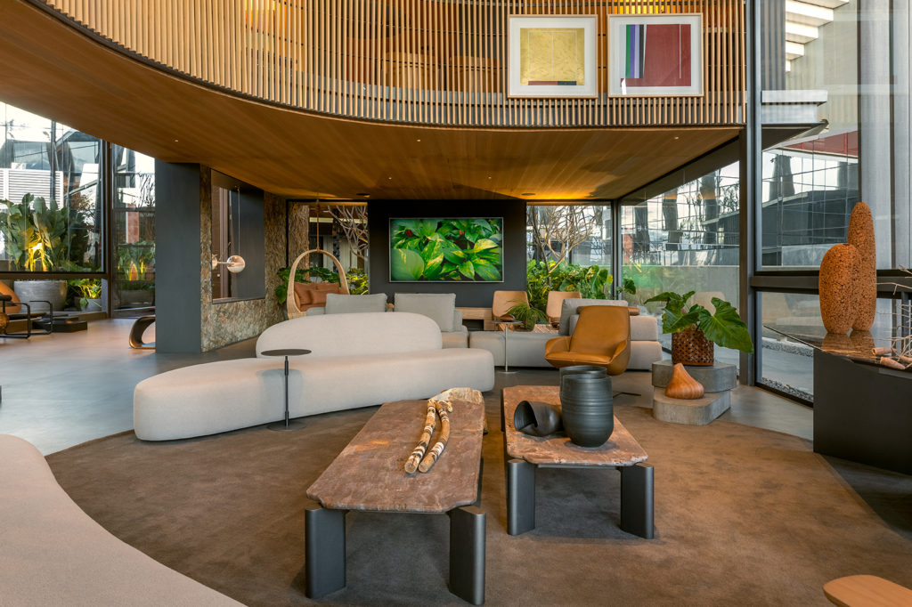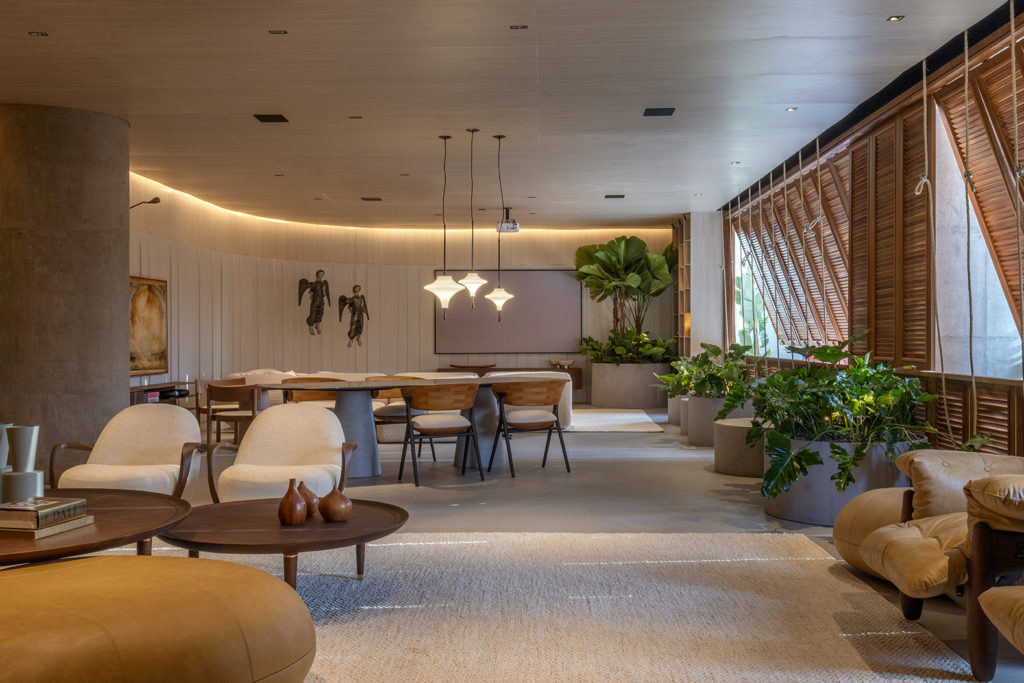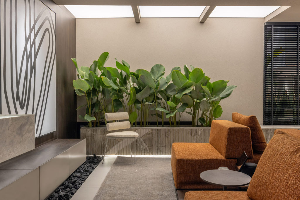 Conforto, tecnologia e acolhimento dão o tom do projeto do trio formado por Simone Turíbio, Marília Turíbio e Dimitri Lociks. O ambiente de 328m² ressalta a importância das pausas e apreciação da natureza, a partir do design biofílico. Os espaços interno e externo se integram. A escolha dos materiais e revestimentos levou em conta os que minimizem os impactos ao meio ambiente. O escritório assina os bancos de pedra e a luminária Íris. A escrivaninha e o banco de pau de ferro são os lançamentos nacionais do espaço.