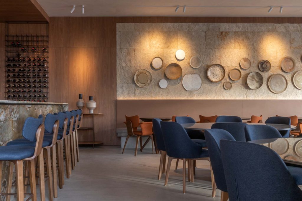 Um dos lugares que promete reunir visitantes, a criação do Restaurante Bar ficou a cargo da arquiteta Tatiana Guedes. Operado pelo Marie Cuisine, o local aposta nas memórias afetivas longevas das porcelanas penduradas nas paredes, com pratos cerâmicos exclusivamente moldados para o ambiente. Entre os elementos utilizados, painéis em mdf jatobá brasileiro, mobília em nogueira, vidro e pedra natural, textura de palha e couro nas cadeiras e linho das cortinas. No bar, destaca-se o balcão iluminado em quartzito crystal fusion. O verde e o azul integram o local em momentos únicos, com uma vista espetacular do pôr do sol na praça arborizada da mostra.