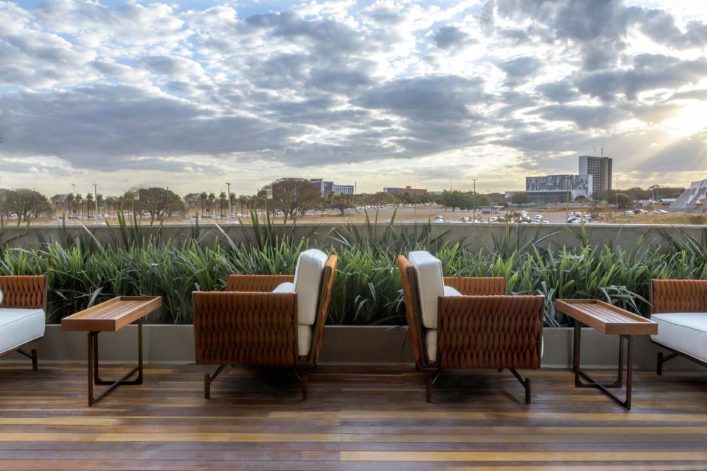 única. Com muito metal, vidro e madeira, as arquitetas Caroline Nogueira e Olívia Campos investiram em cores vivas – com destaque para o céu de Brasília – e utilizaram técnicas de percepção visual, perspectiva e concepção cênica, além de trazer o conceito dos espaços instagramáveis.