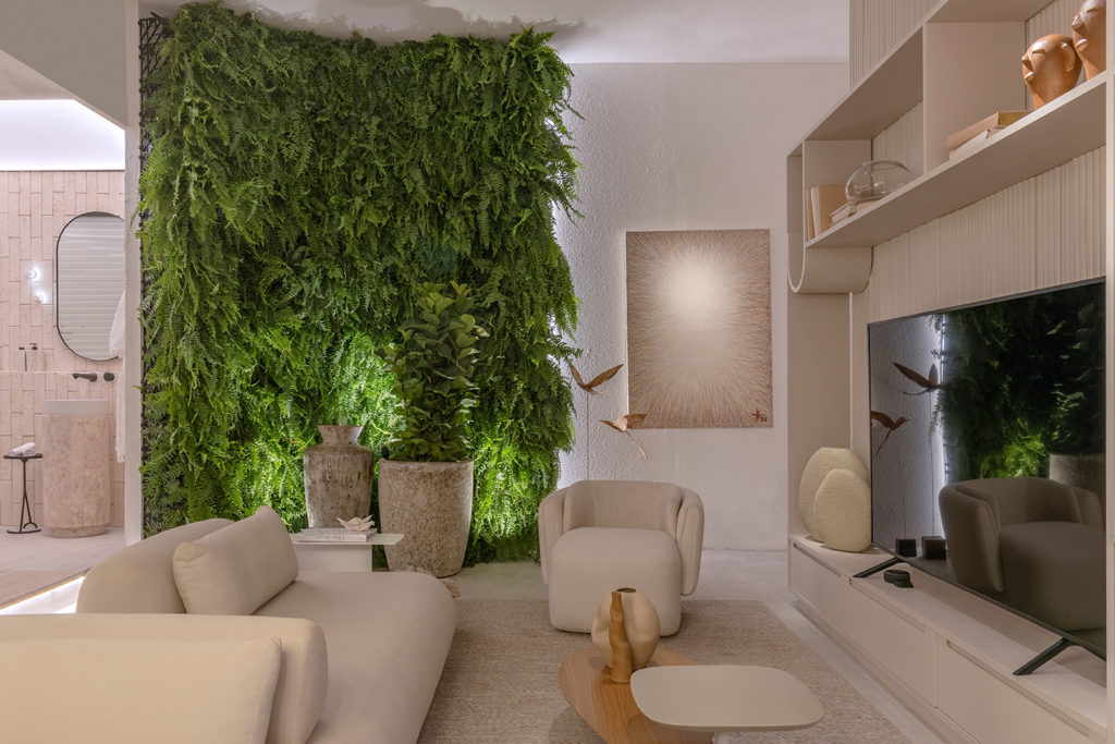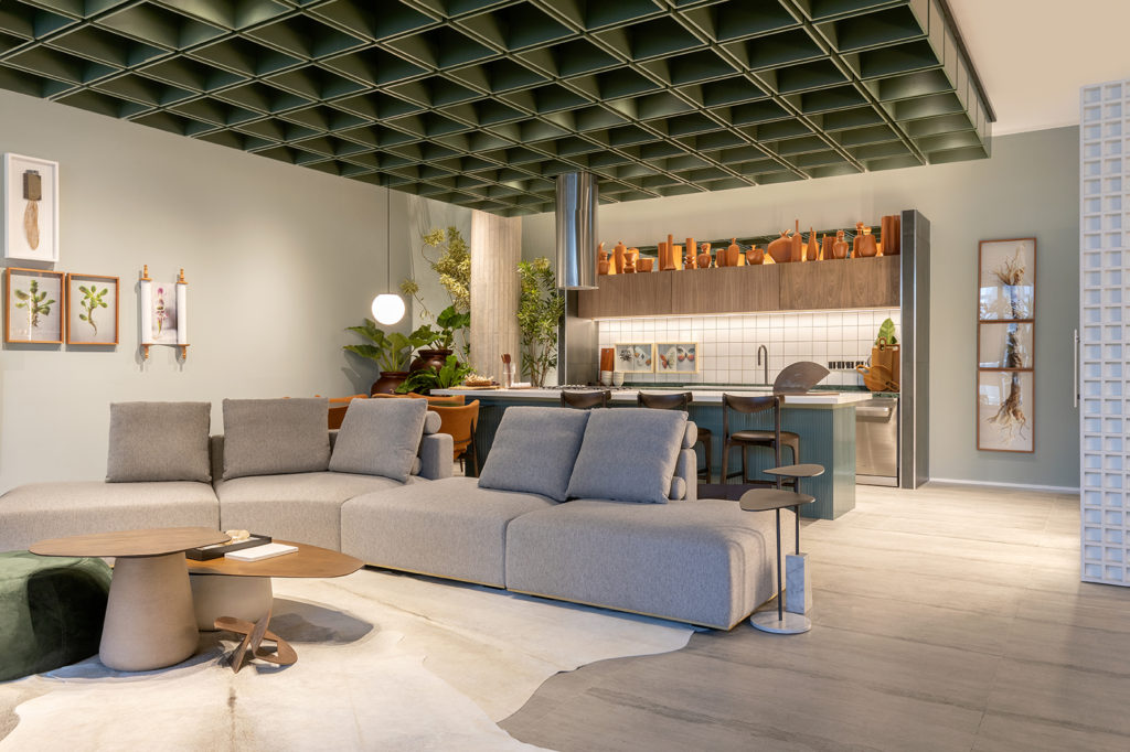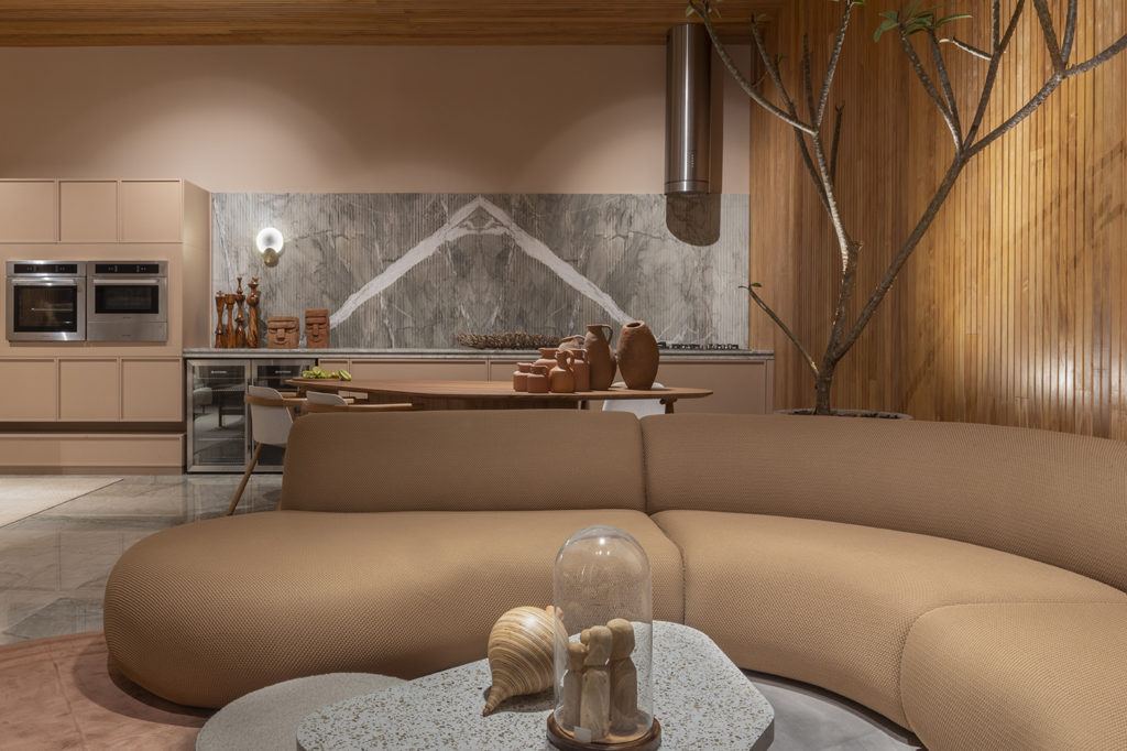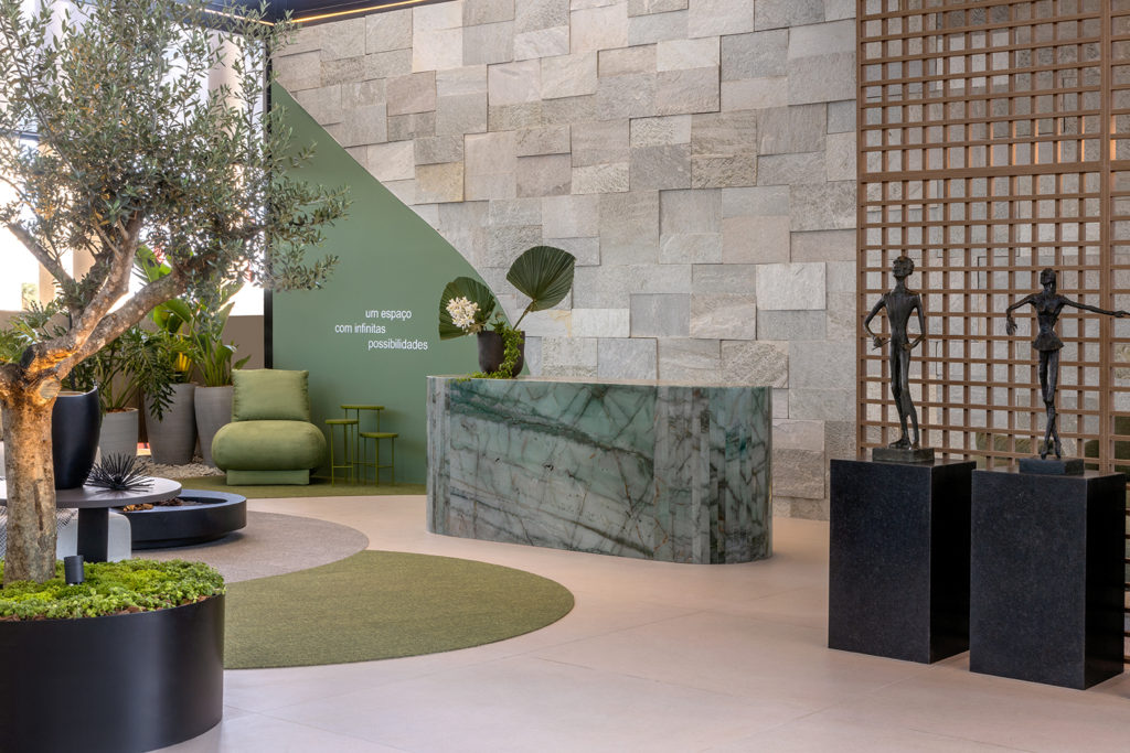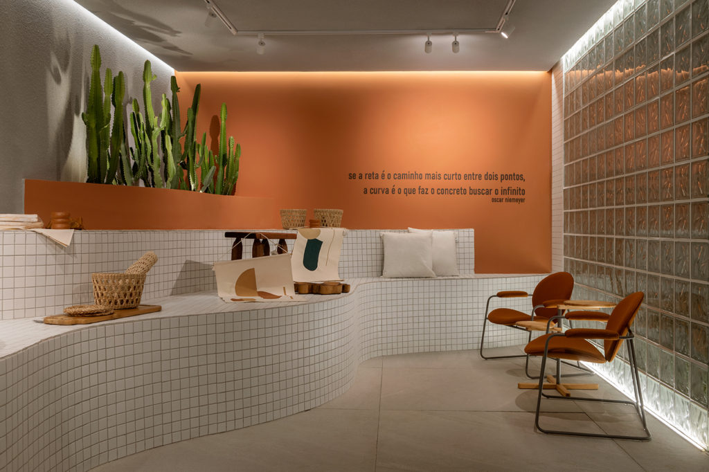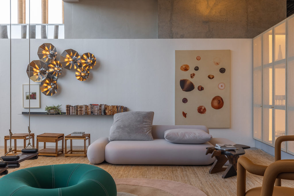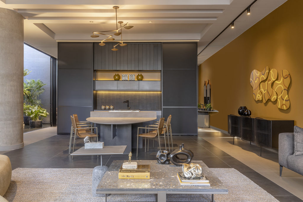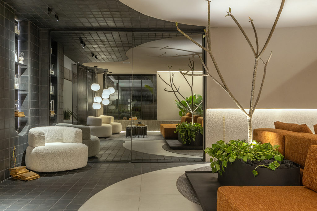 Após a participação no Salone del Mobile Milano de 2022, os escritórios CK Arquitetura e Olzi Arquitetura trouxeram as tendências para a concepção do espaço de 72,62m². Linhas curvas, visual cool e estética clean dão o tom do ambiente, que conta com texturas rústicas, painel de azulejaria desenhado pelo designer Wilson Romão para o espaço, tubos em pvc e jardim vertical de plantas naturais. Romão assina também a Cadeira Baru, exibida na “Poesia do Cotidiano”, principal exposição do Brasil durante a Semana de Design de Milão, e que tem uma versão exclusiva para a mostra, uma curadoria de Bruno Simões. Obras dos artistas plásticos Gabriel Petribu e Eduardo Garcia completam o ambiente.