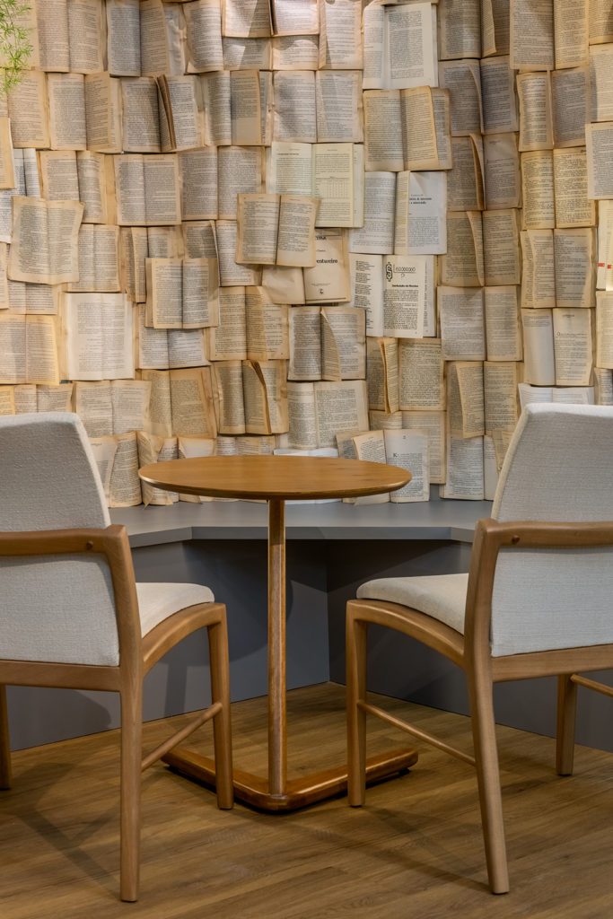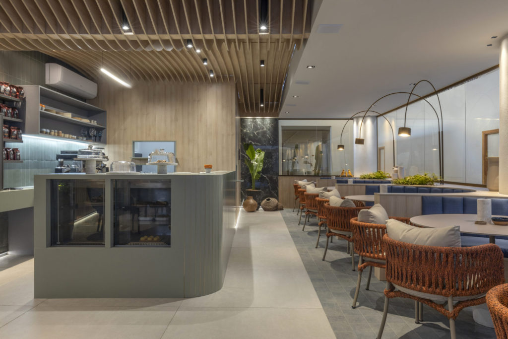 Com base no conceito de neuroarquitetura, Lisi Sandri utilizou-se do design biofílico, por meio das texturas, cores, formas, materiais e objetos, para projetar o Ambiente do Café, com 90,56m². Com o requinte dos cafés especiais e o desafio de conectar o visitante ao ambiente, Lisi utilizou-se do porcelanato, cores claras na madeira, bancadas em tons de verde para alinhar ao conceito de arquitetura orgânica, cerâmicas e pedras em formas de objetos de uso do café, muito presentes no projeto.