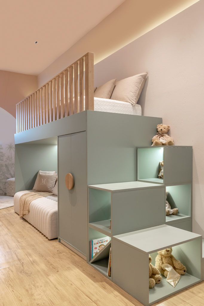O crescimento de uma criança foi a inspiração da dupla para a criação do ambiente de 35m² assinado por Ana Paula Ribeiro e Carol Souto. Com formas orgânicas, concreto aparente, cores neutras e elementos naturais, o quarto infantil tem uma proposta atemporal, com móveis soltos que podem mudar de lugar e adaptações necessárias à medida que a criança cresce. Chama a atenção o móbile artesanal com pássaros esculpidos em madeira, feito pelo artista pernambucano Gegê Pedrosa especialmente para o espaço. Aquarelas da artista Fabiana Queiroga e a pintura floral feita manualmente pelo artista Ricardo de Deus completam o ambiente.
