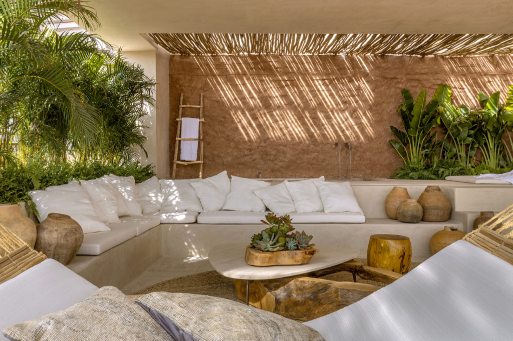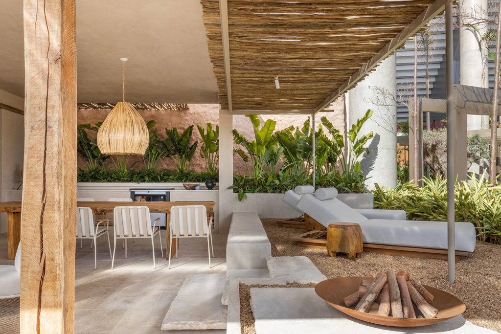 A convite do paisagista Cassio Veiga, a arquiteta partiu da expertise do colega em áreas externas para criar o ambiente batizado de Calmaria, ao lado do parceiro de mais de 30 anos, Alex Rodrigues. O projeto segue a filosofia japonesa Wabi-sabi. No espaço de 230m², há a utilização de técnicas ancestrais da bioconstrução, com materiais como biribas de eucalipto, paredes irregulares de pau a pique, pintura na textura efeito da Coral, piso de retalhos de mármore e limestone. O ambiente conta com sofás de alvenaria e almofadas, SPA, pufes e redes, e ainda um fogão de lenha com vidro cerâmico que dá o toque contemporâneo.