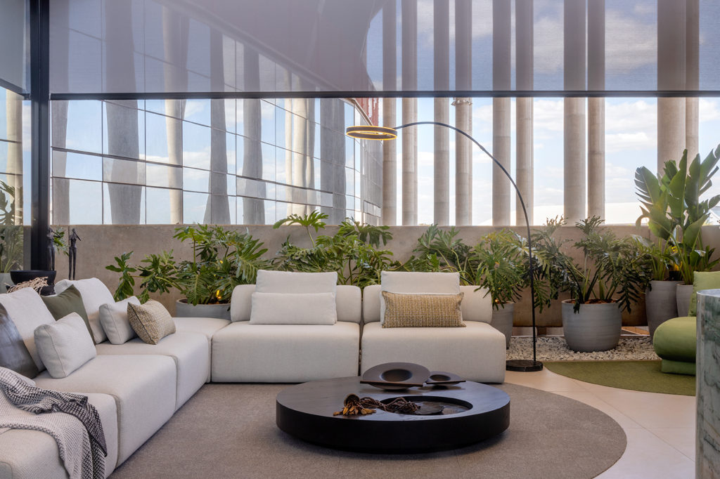 As arquitetas Angela Feitoza e Yassmin Awwad assinam um lounge para a Arena BSB. O desafio foi criar um ambiente fértil para negócios, quebrando a barreira formal do corporativo por meio de elementos naturais. O design biofílico é utilizado nos 100m² e equilibra o concreto do Estádio com quartzito verde natural, muxarabis em madeira e tecidos com texturas marcantes. O espaço conta com mobiliário de Luan del Sávio, Paulo Satori, Bruno Simões e Eminência em Preto. As obras de arte que compõem a cena são esculturas do artista plástico Ricardo Barsuglia, do acervo pessoal de Richard Dubois (presidente da Arena BSB).