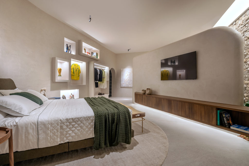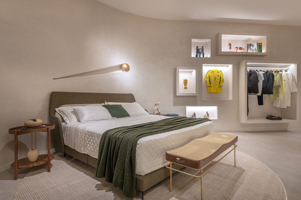 Em ano de Copa do Mundo e com o estádio como local que abriga a CASACOR, os sócios Telma Versiani e Rafael Versiani criaram o ambiente inspirado no ex-zagueiro da seleção e morador de Brasília, Lúcio. Inspirado na filosofia wabi-sabi, o espaço de 56m² traz uma parede diagonal em formato orgânico que divide o ambiente do quarto com o do banho. O projeto que integra o ambiente ao jardim apresenta peças do acervo do próprio Lúcio, como a camisa utilizada no pentacampeonato brasileiro, a réplica da taça da Copa do Mundo de 2002, troféus e chuteiras.