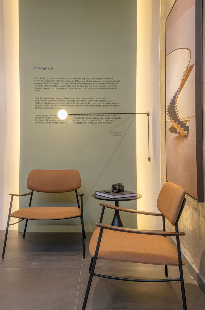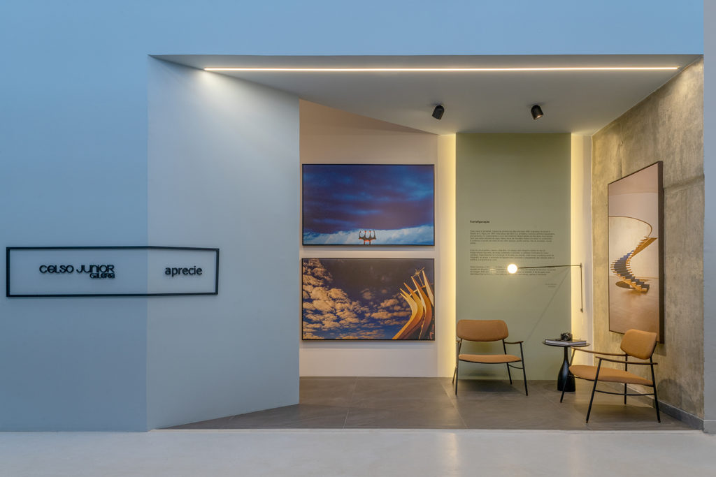 O escritório estreia na mostra com um ambiente dedicado ao premiado fotógrafo Celso Junior. Obras do artista, em diferentes formatos e tamanhos e com fotos predominantes de Brasília, estão espalhadas pelos 23m². Com pintura em tons pastel, iluminação direcionada para as obras e fachada de vidro, o espaço conta com duas poltronas, um aparador e um banco em madeira. A ideia das arquitetas Amanda Rodrigues e Bianca Falcão é que as obras temáticas despertem nos visitantes suas melhores memórias afetivas com a capital.