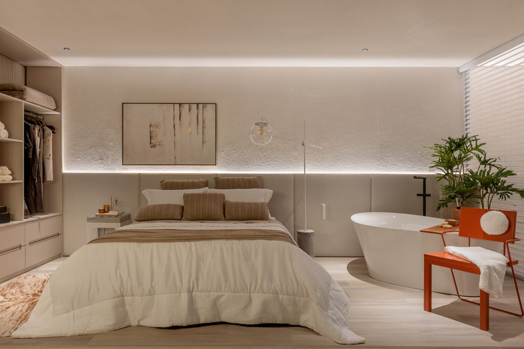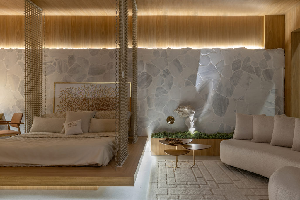 Maria Araujo Arquitetura e Design assina o Quarto Infinito, com 80m². Entre as tendências, paredes curvas e perfis magnéticos que alteram a iluminação do local sem dificuldade. Outra novidade é a Arquitetura Biofílica, que utiliza elementos da natureza para transformar espaços, trazendo benefícios à saúde e ao bem-estar. O projeto possui tons monocromáticos e neutros, com texturas que trazem bossa ao ambiente. Ainda, cortinas de linho e duas floreiras ricas em vegetação. A presença da Cadeira Blues, dos irmãos brasileiros Fahrer, que já tiveram peças expostas no MoMa (NYC) e no Pavillon Le Corbusier (Zurique), é um dos grandes destaques, pois possui pouquíssimas unidades no mundo.