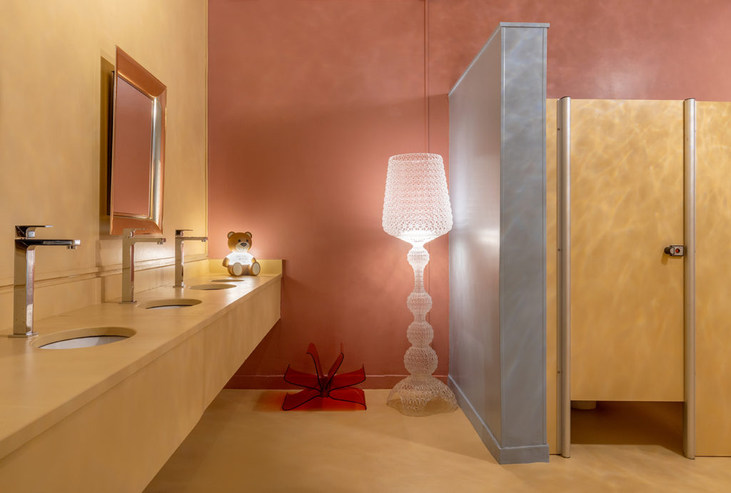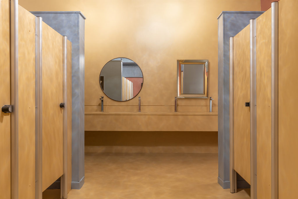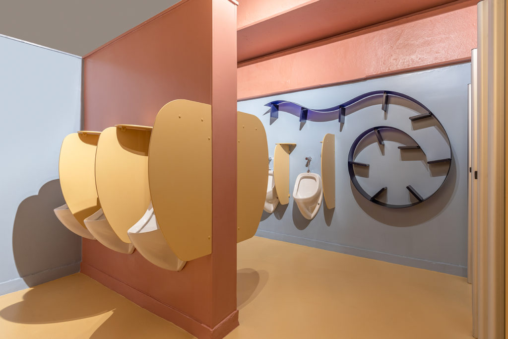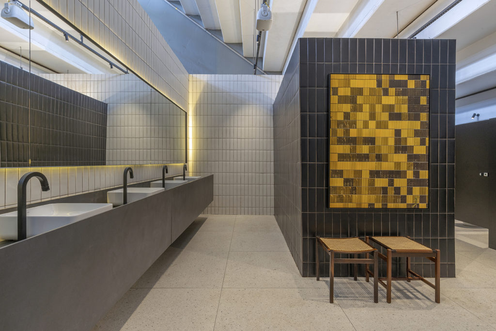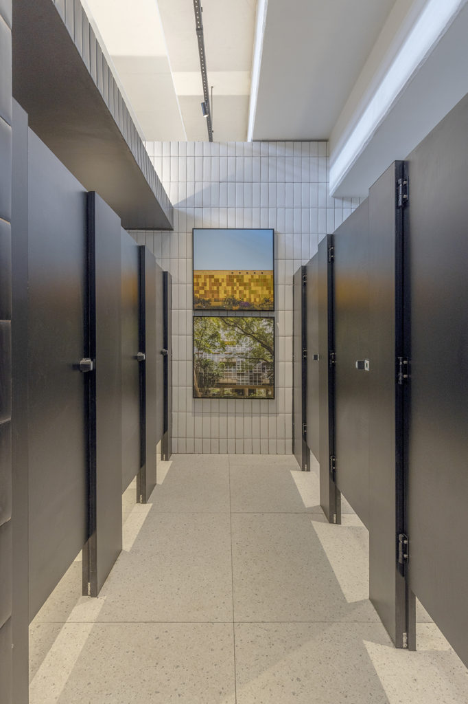 O arquiteto Clay Rodrigues criou o projeto para os banheiros públicos que ficará permanentemente na Arena BRB. Com 70m², os tons escolhidos foram baseados na paleta de cores do arquiteto francês e modernista Le Corbusier. As cores azul, amarelo e vermelho ganham pigmentação acinzentada para fazer contraste com as peças italianas de acrílico espalhadas pelo ambiente. Elas entram na proposta do multicolorido, divertem, transformam-se em peças decorativas e esculturais, deixando a visita ao banheiro mais lúdica.