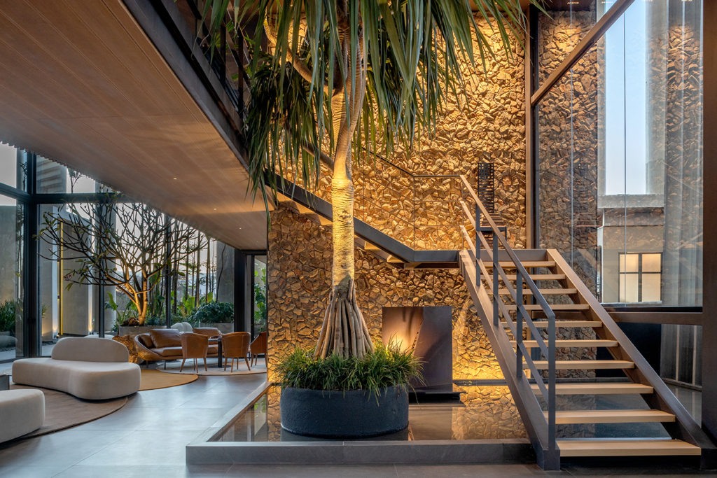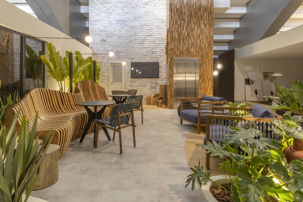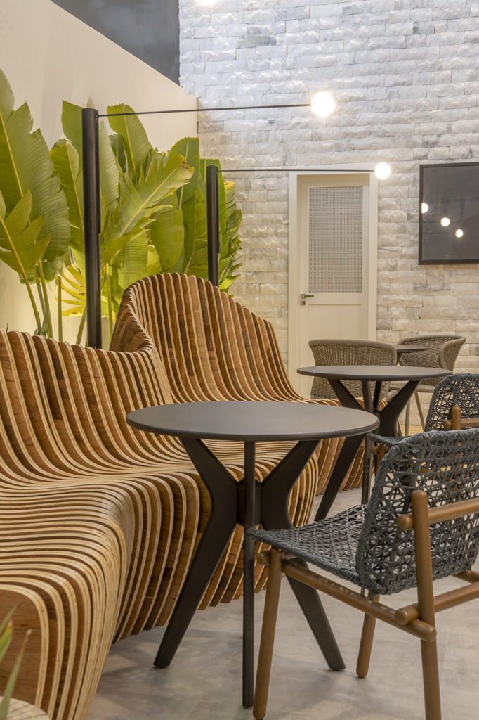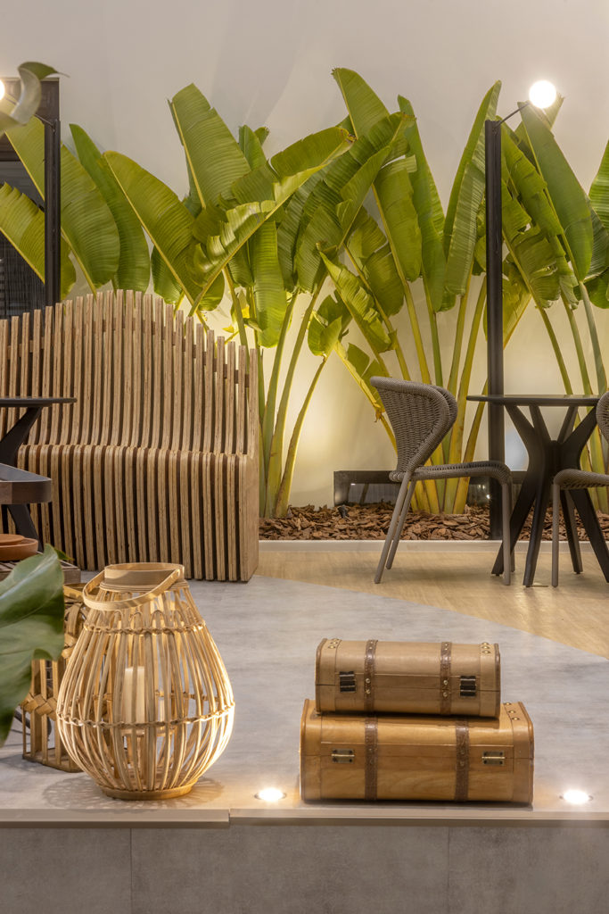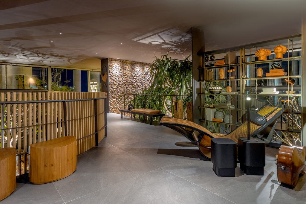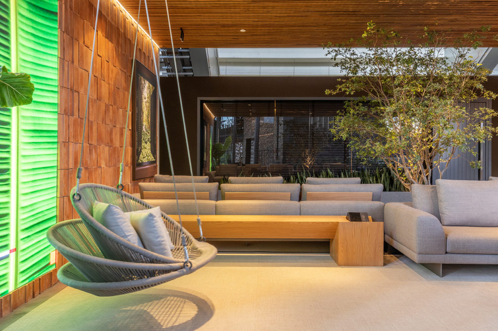 Para o ambiente de 52m² criado para a Aviva Vacation Club, as profissionais Ana Carolina Lima e Ana Carolina Falconi se inspiraram em resorts do Nordeste e de Goiás. Com traçado de linhas sinuosas, elementos artesanais e design biofílico, as arquitetas apostam na acessibilidade, com rampas que levam a um elevador trabalhado em madeira interna e externamente que dá acesso ao bar no pavimento superior. A tecnologia vem no processo de criação dos móveis, como o banco paramétrico e a projeção mapeada, e também há utilização de palha, pedra natural, madeira, vegetação, peças artesanais e decoração com fitas do Bonfim, tudo para trazer o clima da Bahia e de Goiás ao ambiente.
