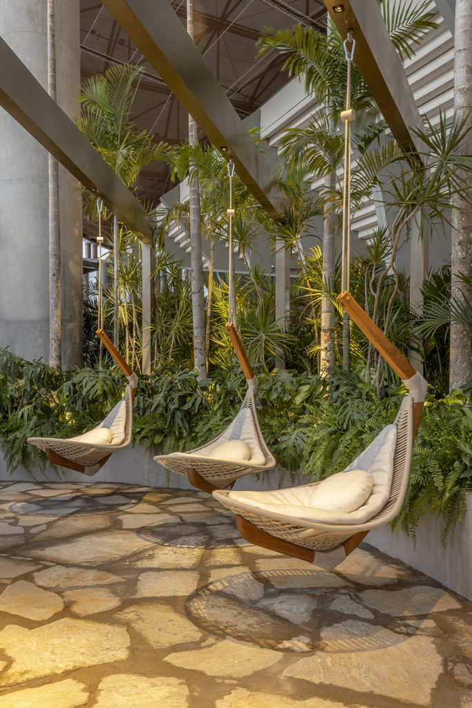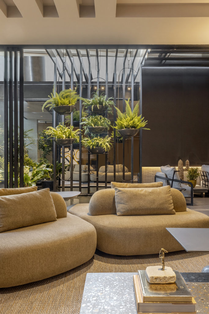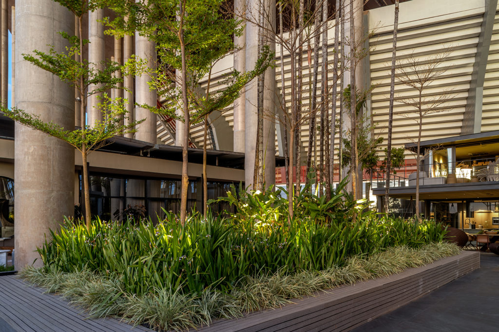Em meio ao cenário árido do estádio, onde o concreto predomina, o verde da natureza traz paz e aconchego no jardim assinado pela arquiteta e urbanista Marina Pimentel. As pedras naturais que compõem o percurso sinuoso antagonizam com o pergolado metálico. A reconexão com o natural no espaço de 410 m² foi o start para a criação desta praça, cujo paisagismo contemporâneo envolve uma vegetação densa e espécies de grande porte. O toque de nobreza ficou por conta dos móveis selecionados e da iluminação cênica. Um convite à contemplar a infinitude da natureza.