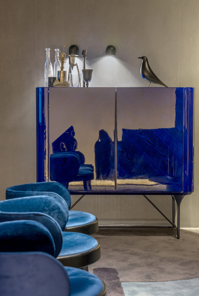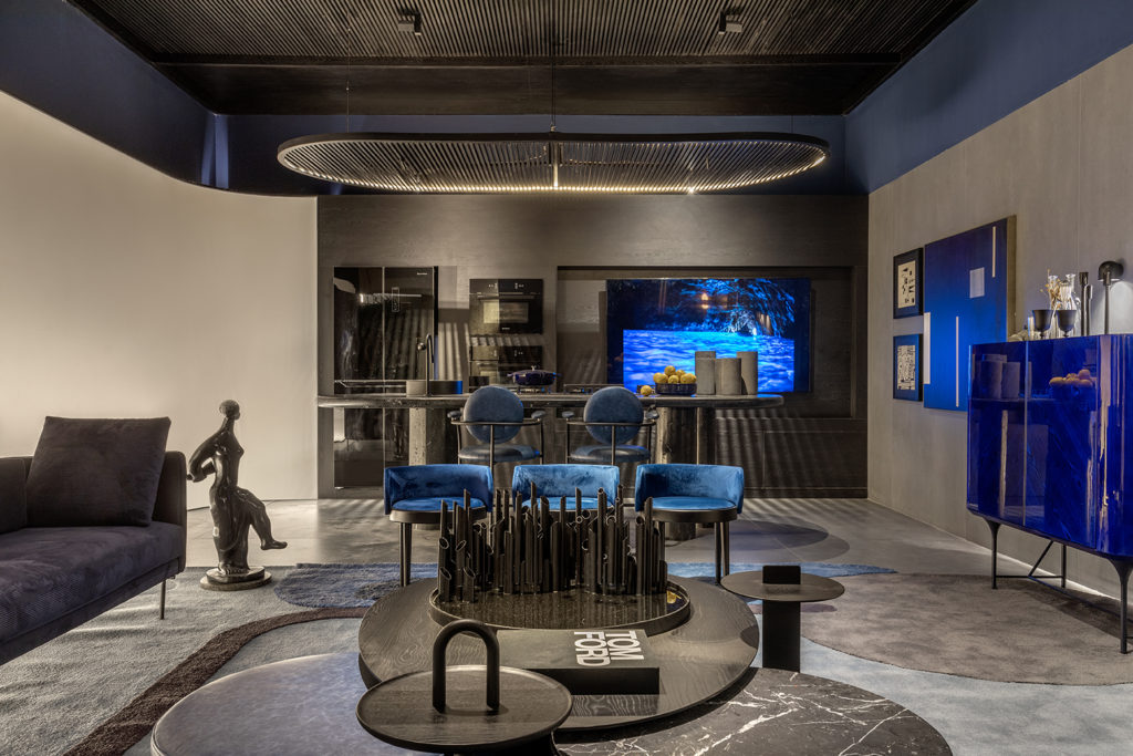 Os arquitetos Elisa Fraga, Guilherme Bussamra e Marcelo Marcolino apresentam o Abito Blu, que abrevia a casa como lar e dita o modo de “vestir” a casa. Com inspirações da Milan Design Week de Milão 2022, a paleta de azuis escuros mesclados a tons mais saturados nortearam a escolha dos demais itens, como lacas e lâminas de madeira brilhantes, perfis tubulares metálicos, veludos, formas orgânicas e de cantos arredondados. Isso somado à exuberância do mármore. O ambiente de 55m² traz o modo cosmopolita de viver italiano e o despojamento do design mundial. Para completar o espaço, obras de Burle Marx, Marcelus Freschet e Sônia Ebling.