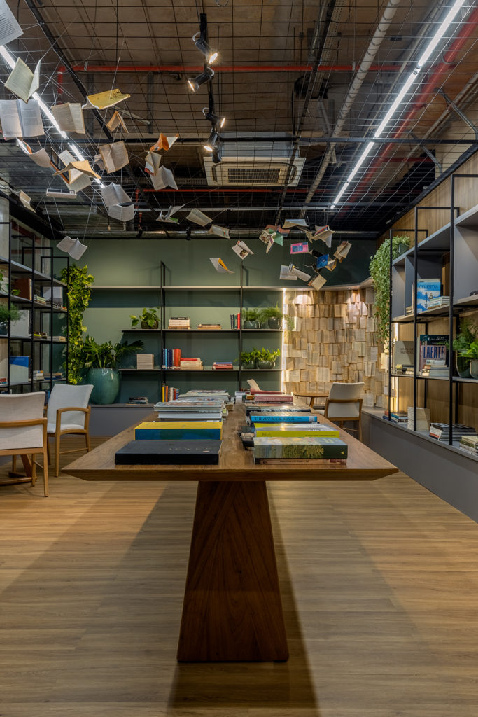 Com o objetivo de fugir da estética de livrarias comuns, a designer de interiores Glaucia Almeida utilizou da biofilia para compor o espaço, numa união com o estilo industrial. O industrial está presente na serralheria no forro, nas prateleiras e na porta; e o biofílico com as plantas e nas cores das paredes. O piso vinílico também foi utilizado nas paredes. Peças de cerâmica italiana do acervo da livraria dão charme ao ambiente, assim como fotografias de Boechat. Com 68m², o projeto foi pensado para ser funcional e, ao mesmo tempo, acolhedor, com a natureza presente para dar uma sensação de calmaria e respiro para a mente.