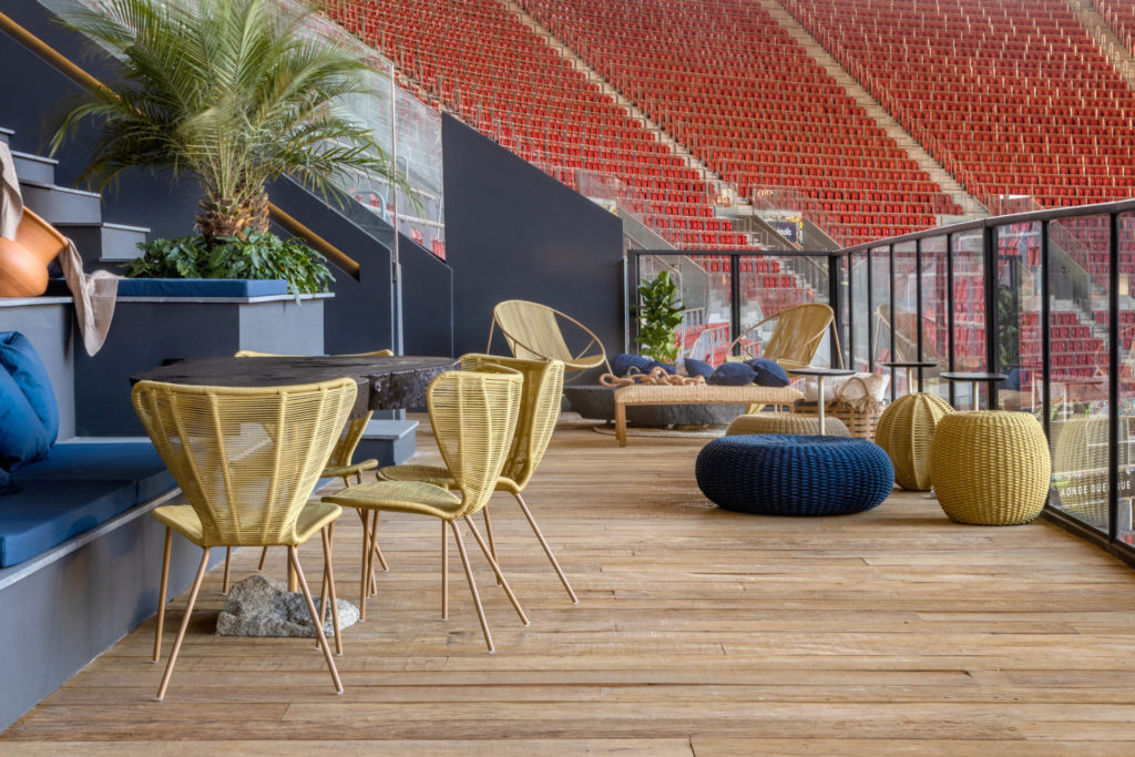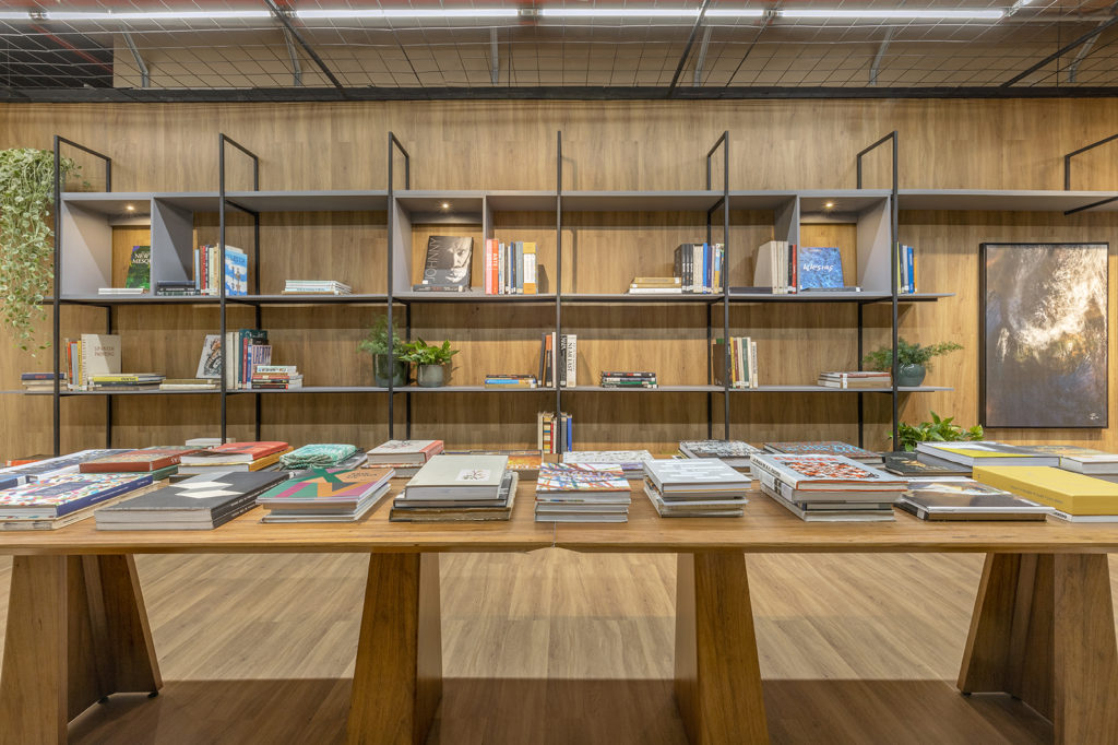 Um portão de acesso vira uma praça para se admirar as colunas do estádio. Com essa vista e o vão livre de 10m, o projeto buscou ser um local de experiência, um ambiente acolhedor no meio de toda a monumentalidade do espaço. A arquiteta Juliana Santana investiu em uma pedra moledo em uma das paredes para conversar com o concreto existente. O espaço de 50m² tem uma estante especialmente projetada em madeira freijó e talagarça, que não bloqueia a luz nem a ventilação natural. Além do mobiliário repleto de lançamentos, destacam-se obras dos artistas Christus Nóbrega, Verdiana Leite, Paola Muller e Fabiana Barbosa completam o ambiente.