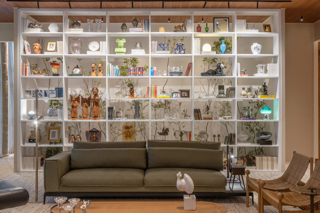 Debruçado no tema Infinito Particular, o arquiteto Hélio Albuquerque mostra muito de si através dos seus objetos no espaço de 80m² que homenageia sua companheira de trabalho por 27 anos, Sonia Peres. O projeto aproveita o painel existente de Athos Bulcão, usa tons neutros e muitas texturas em um ambiente que confirma que não há a necessidade de grandes intervenções em uma reforma para se fazer um espaço contemporâneo e acolhedor. Destaque para os móveis modernos, para as obras de Ceschiatti, Burle Marx, Sônia Ebling, Siron, Tarcísio Veloso, Portinari, Picasso, Salvador Dali, Chagal e para a luminária LBB da arquiteta ítalo-brasileira Lina Bo Bardi.