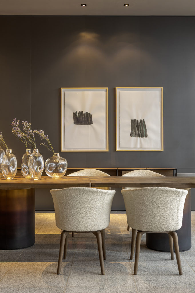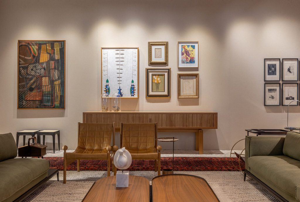Com 92m², o espaço LLAR foi pensado pela arquiteta Dalilla Menegotto. O ambiente consiste em um grande living integrado com uma sala de jantar e uma adega e foi concebido para receber e reunir pessoas. Valorizando a organicidade dos materiais, os mobiliários foram dispostos de maneira cuidadosa, para possibilitar um ambiente amplo e fluido, características que a arquiteta sempre preza em seus projetos. As obras de arte foram cuidadosamente exploradas para contar histórias no ambiente. Destaca-se a escultura posicionada dentro da adega, criada especialmente para o espaço com inspiração à Praça dos Cristais.