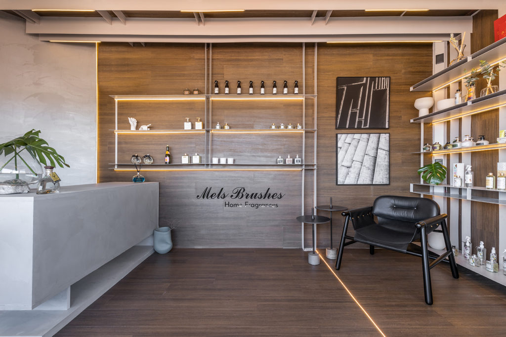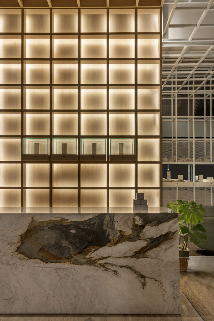 O escritório MAS Arquitetura + Interiores e On Arquitetura projetou o espaço de 35m² inspirado no processo de criação de produção das joias com um layout especial em uma forma diferente de receber o cliente de uma joalheria. O uso da serralheria e da pintura eletroestática se destacam no ambiente, que conta ainda com painéis em MDF amadeirado e pedra natural exótica. A ideia é trazer um ambiente de designer de joias mais rústico, numa contraposição ao bruto, que é o estado inicial, com o belo, que define a peça já finalizada. O toque artístico fica por conta de um vaso da artista Carol Gay e uma tela especial do artista Marcelo Sollar.