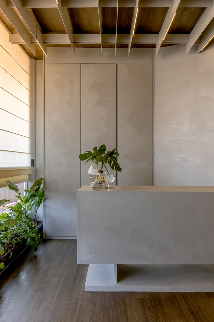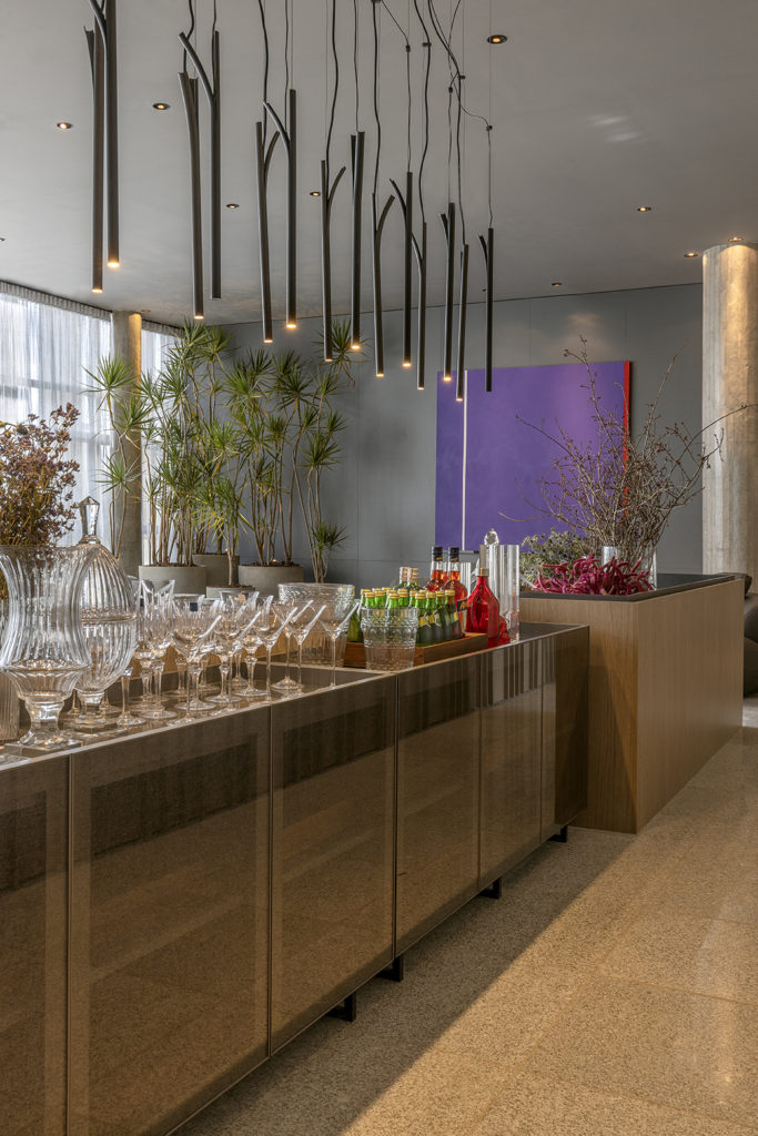 Foi pensando na essência do SER, desnudando as diversas “faces” do nosso infinito particular, a fluidez e a dualidade do existir, junto às características intrínsecas, leves e poéticas do espaço – painéis artísticos de Athos Bulcão, iluminação natural, vista monumental de um local que é palco de tantos momentos de celebração, pilares e vigas de concreto – que o trio formado pela arquiteta e urbanista Renata Vieira e as designers de interiores Laísa Figueiredo e Juliana Velloso projetou esse ambiente de 78m². O espaço segue a tendência de ambientes integrados, iluminados e ventilados, traz tons claros junto aos amadeirados, linhas retas e curvas ocupando o mesmo espaço, materiais naturais e vegetação.