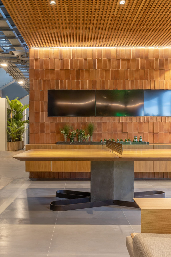 Com o objetivo de interagir com o estádio e o imenso céu da cidade, Larissa Dias projetou o ambiente de 133m2 com grandes aberturas para o exterior. O interior foi suavizado pela madeira em tons claros, trazendo aconchego. No teto, o MDF amadeirado Oasis. Esquadrias com venezianas em madeira maciça, suspensas por cordas de sisal, remetem as primeiras construções na cidade com uma releitura contemporânea e permitem o infinito céu de Brasília adentrar pelo ambiente. Lucio Costa disse que “o céu é o mar de Brasília”, resumindo em poucas palavras o nosso céu. Pelo espaço, mobiliário de Sérgio Rodrigues, Jader Almeida, Estudio Bola e Guilherme Wentz. Chamam atenção as esculturas de anjos em bronze de Ceschiatti, como os da Catedral de Brasília, e os quadros de Carlos Araújo.