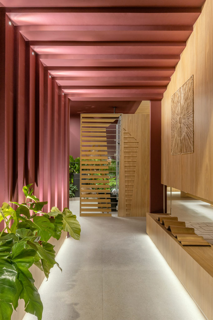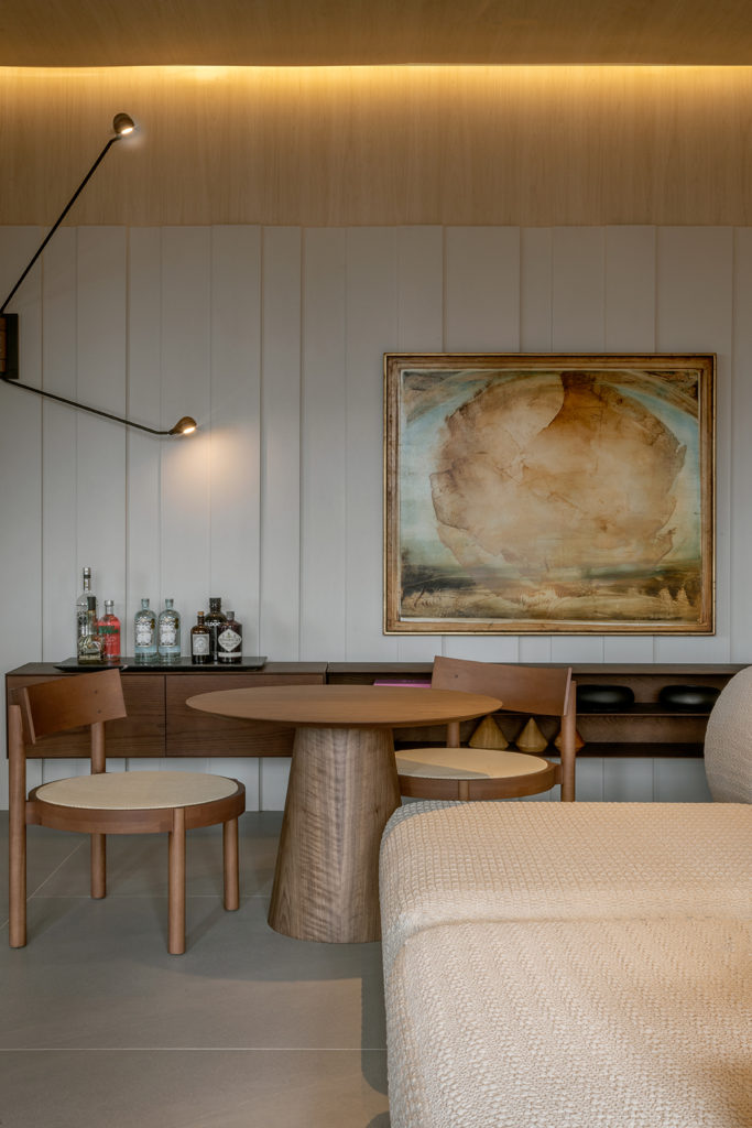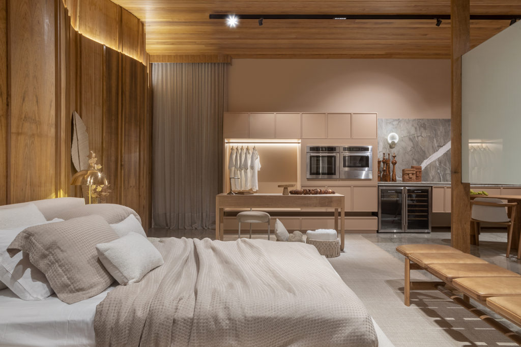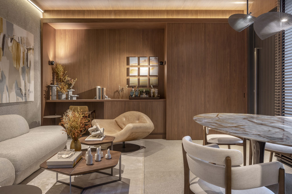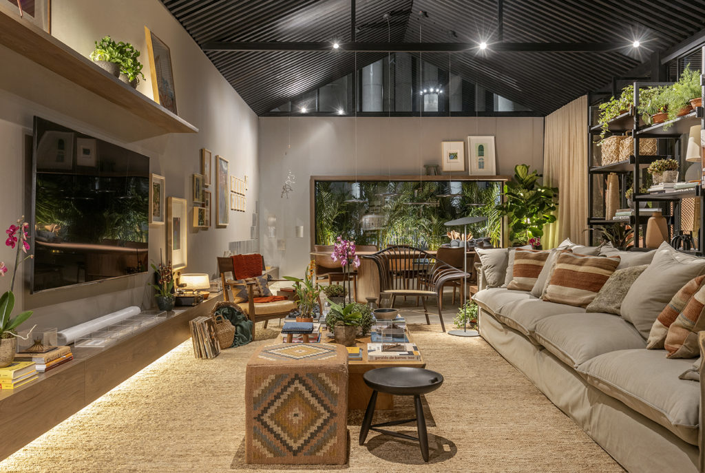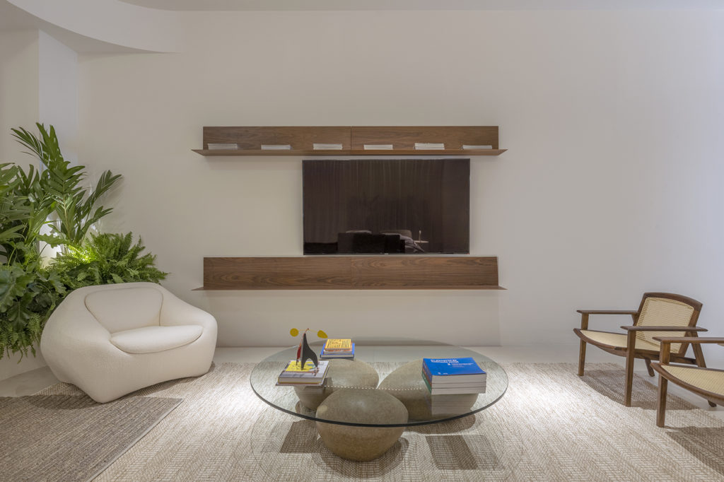 O projeto de 69,60m² assinado por Karine Gonçalves e Marcelo Motta foi pensado no momento recém-vivenciado, na necessidade de introspecção, na convivência rara. A ideia é apresentar a casa como uma caixa de relíquias. Madeira natural de reflorestamento garapeira, pedra nobre natural e tecidos de algodão tramados trazem a sensação de acolhimento. No mobiliário, destacam-se a poltrona Gorila, do designer Philipe Fonseca, inspirada na junção dos valores africanos com a cultura brasileira; e a Cadeira Corda, de fabricação artesanal com madeira maciça. O projeto
