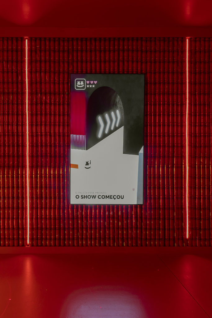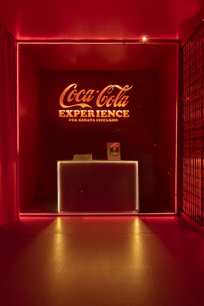 O ponto de partida do projeto foi a Coca-Cola Marshmello, criada com a colaboração do DJ estadunidense Marshmello. O ambiente da arquiteta Renata Ciccarini, totalmente na cor vermelha, do piso ao teto, apresenta atmosfera de balada com a utilização de neon e laser. O ambiente por ser um módulo construtivo, provoca a sensação do visitante estar em uma caixa e o convida a uma experiência que visa ativar os cinco sentidos: o tato, através das texturas; o olfato pela essência contida no espaço; a visão, com as luzes e as imagens emitidas pela TV; a audição, provocada pelo som ambiente e o paladar, despertado com o sabor do novo refrigerante semaçúcar e com sabor morango.