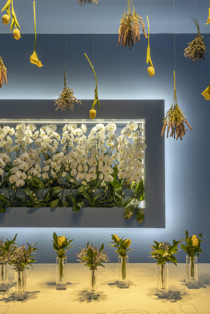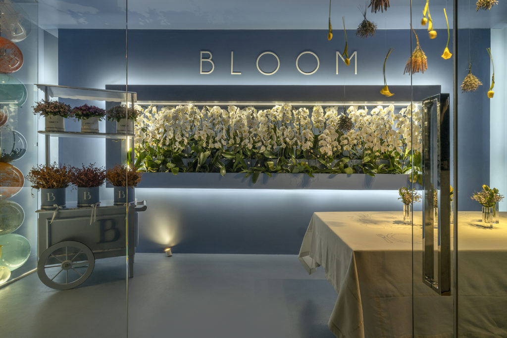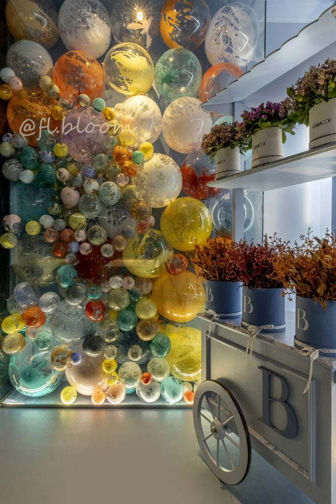 Um dos ambientes mais instagramáveis da mostra, Roberto Guedes projetou uma parede de balões e flores excêntricas. Iluminação de LED dá o charme ao ambiente minimalista. A inspiração do arquiteto foi em lojas italianas ligadas à área de moda e flores, após uma longa pesquisa na forma como estabelecimentos destes nichos apresentam suas criações. Com 18m² em construção modular, o ambiente traz a cor azul tibet. Usando a mesma cor em todo o ambiente com o intuito de levar o visitante a valorizar apenas um momento, o espaço traz ornamentação com pratos exclusivos, vasos e flores.
