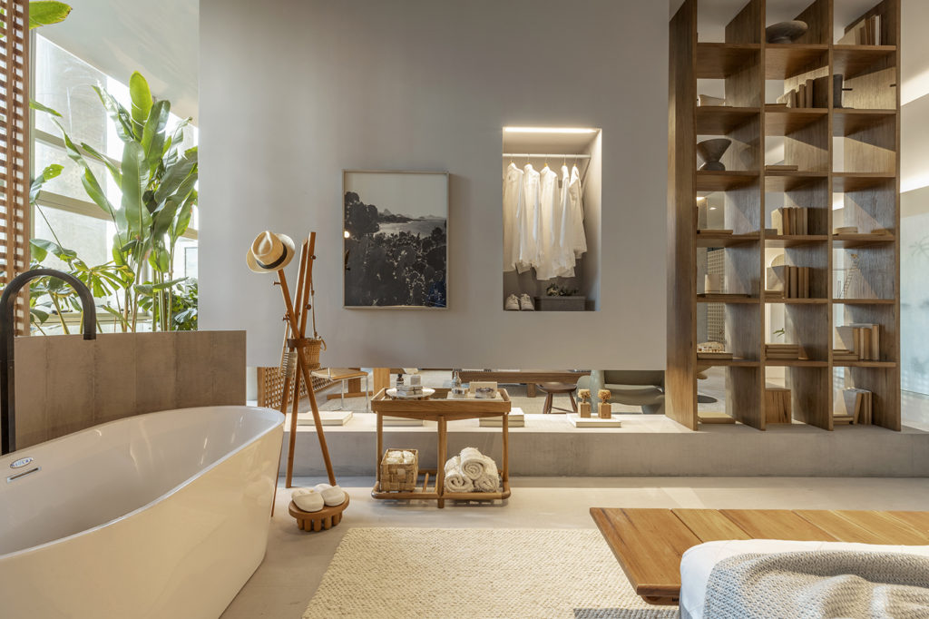 A suíte do hotel projetada por Luciana Cunha, é composta por elementos naturais como madeira, pedras e plantas, e também a mistura de linhas retas e orgânicas. O espaço de 45m² tem janelas sanfonadas e vazadas, a madeira e a cor vinho quente têm continuidade funcionando como pano de fundo para outros materiais de destaque, como o mármore grego com acabamento em semente de acácia. Outro destaque para o tema é o hall que traz em perspectiva o ponto de fuga. Uma árvore de outono completa o espaço.