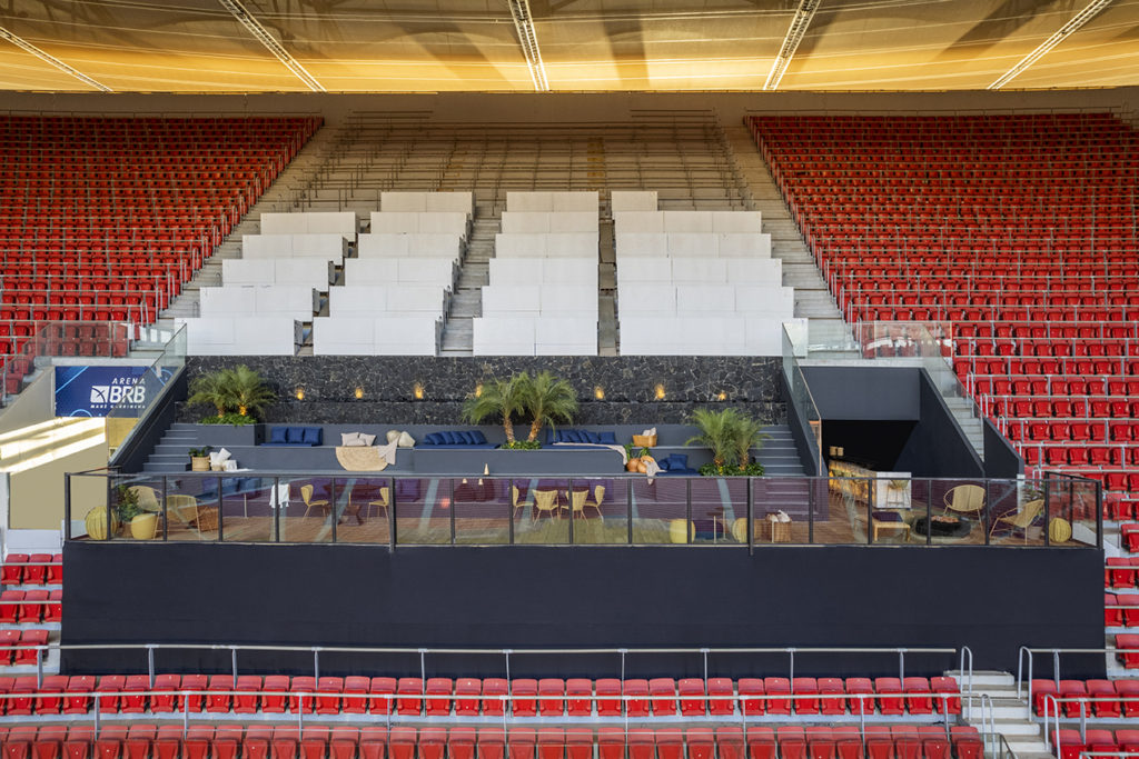 Com 70m², o inusitado projeto das arquitetas Gabriela Gontijo e Mariana Hummel destaca-se por garantir a contemplação do interior do estádio. No ambiente, o BRB vai realizar encontros com clientes nas áreas reservadas para conversas mais intimistas. A dupla utilizou de madeira reaproveitável, queimada, na cor negra, nas mesas e na bancada do bar – onde o material ganha destaque ao pousar sobre a luminosidade do ônix. Cestarias, sisal e madeiras cruas trazem a concepção de um infinito particular. No espaço, haverá o lançamento de uma nova poltrona criada pelo designer Samuel Lamas e uma pedra Bossa Black.